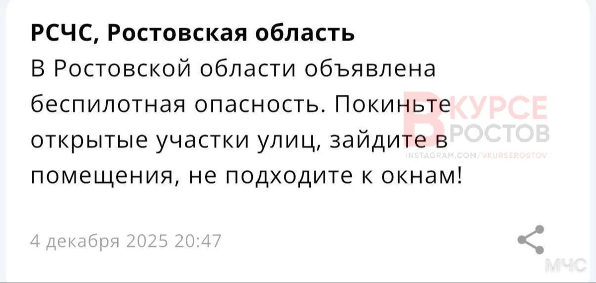 ‼️ Беспилотная опасность объявлена по всей Ростовской области.
