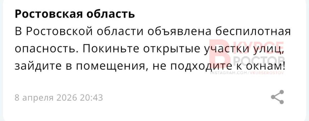 ❗️Вслед за ракетной опасностью в области объявлена беспилотная опасность