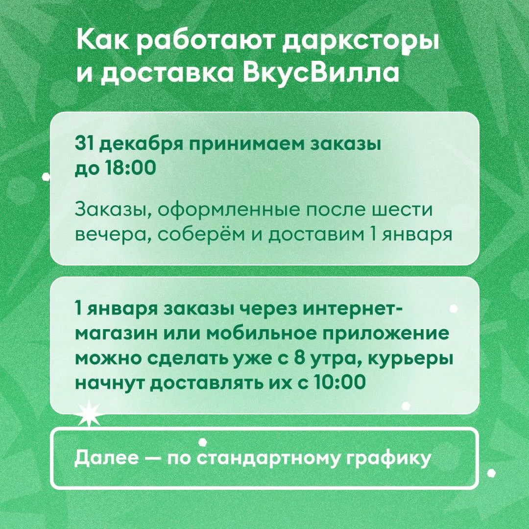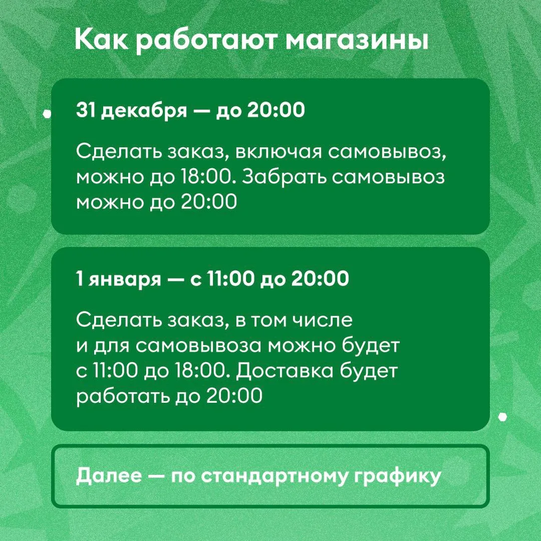 Ответили в карточках. А в тексте поста — напоминаем: для удобства доставку на 31 декабря можно заранее заказать 30 числа.