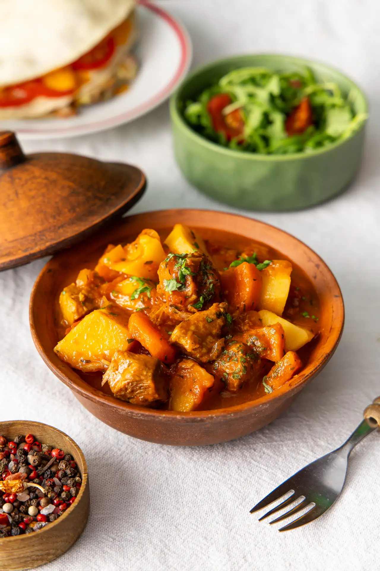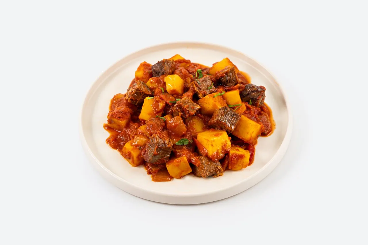 Наваристое овощное рагу по традиционному рецепту жителей юга России: нежные кусочки свинины томятся в томатном соусе с гвоздикой, кориандром и кардамоном, молодая морковь и картофель пропитываются пряным бульоном и становятся мягкими и сочными, а свежая петрушка и укроп добавляют яркую травяную ноту.