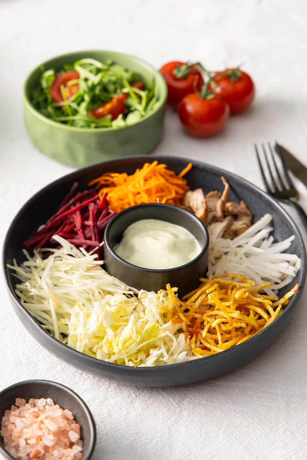 Традиционный салат из Красноярска с жареным куриным бедром, свежими овощами и хрустящей картошкой объединяет в себе лучшие черты азиатской и русской кухни: по одной из легенд, в город рецепт привезли корейские рабочие, строившие местную ГЭС. Наша версия немного отличается от классической, но не менее вкусная.