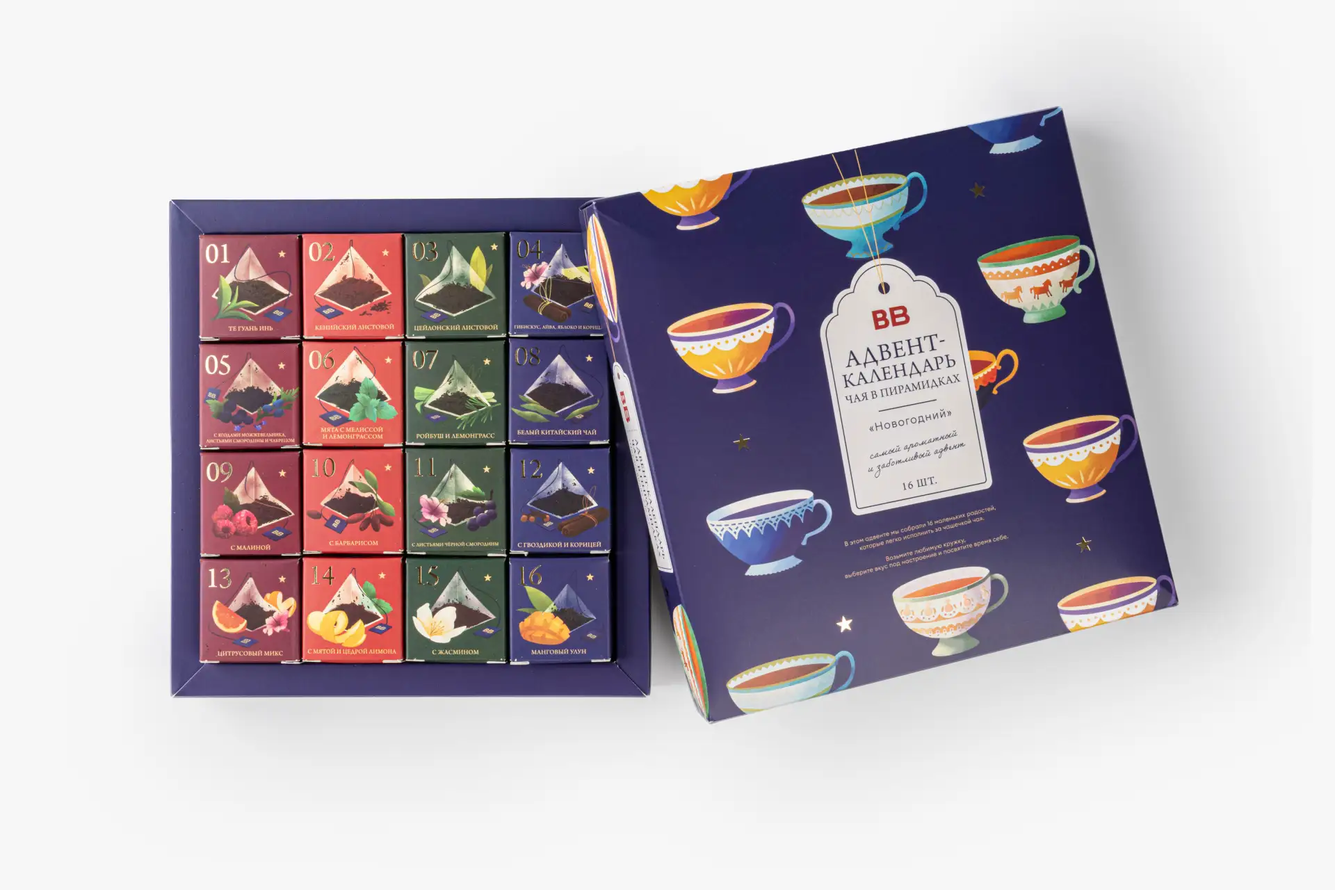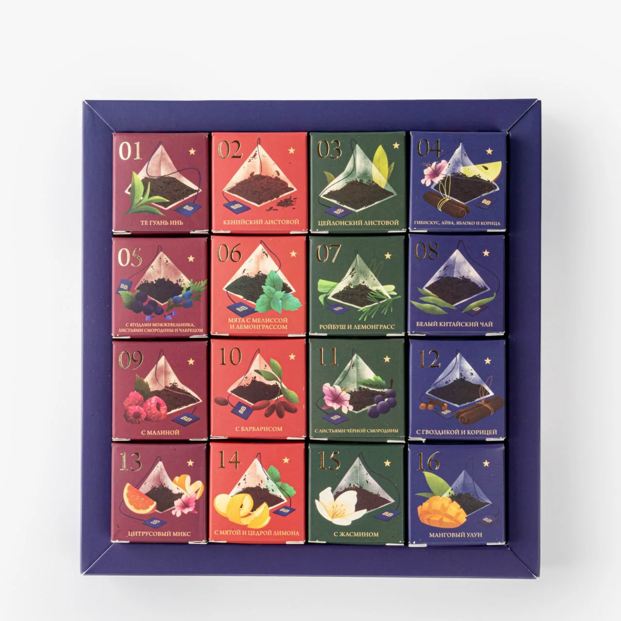 Каждый день — новая пирамидка и новый вкус: от классических улунов и кенийских чёрных чаёв до фруктовых и пряных композиций. Такой календарь превращает ожидание праздника в приятный ежедневный ритуал — а ещё это приятный подарок для всех, кто любит как следует почаёвничать.
