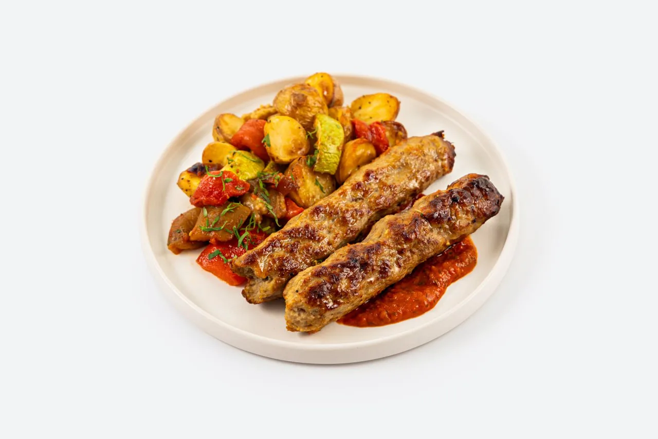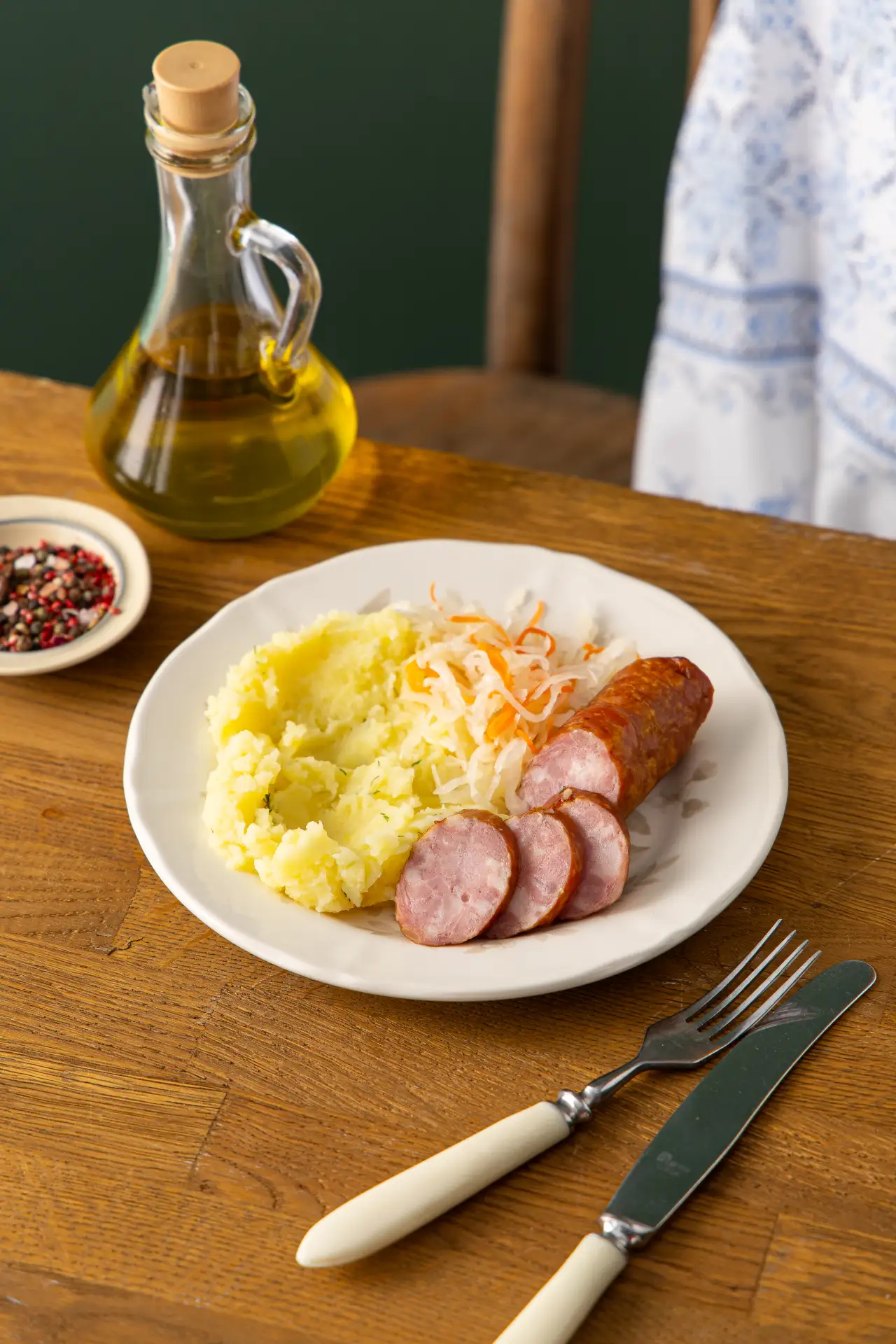 Простое и сытное блюдо в традициях сибирской кухни: толчёная картошка со сливочным маслом и сочная свиная колбаска («каралька») с лёгкими нотами чеснока и перца. Квашеная капуста на растительном масле вносит яркую кислинку, а свежий укроп придаёт аромат и свежесть.