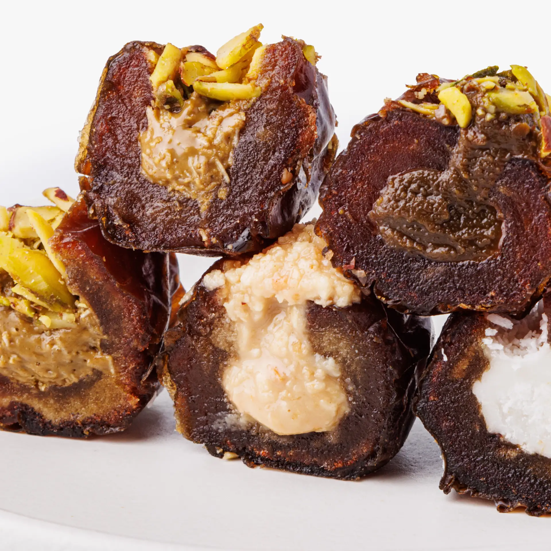 Каждый финик — как мини-десерт: тягучая сладость и внутри своя «изюминка» — от фисташковой пасты и арахиса до кокоса и хрустящего катаифи.
