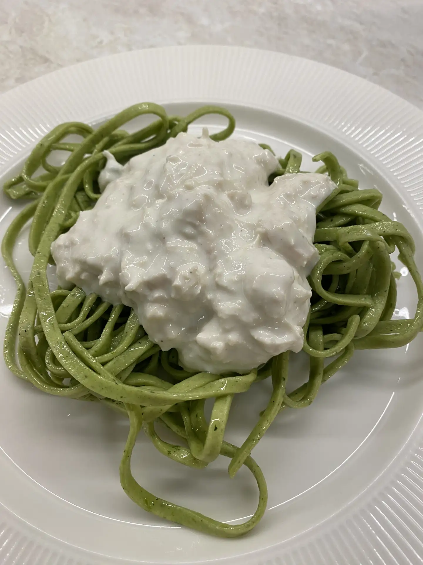 «Котлета паровая из филе атлантической трески и радужной форели с пастой и шпинатным соусом»