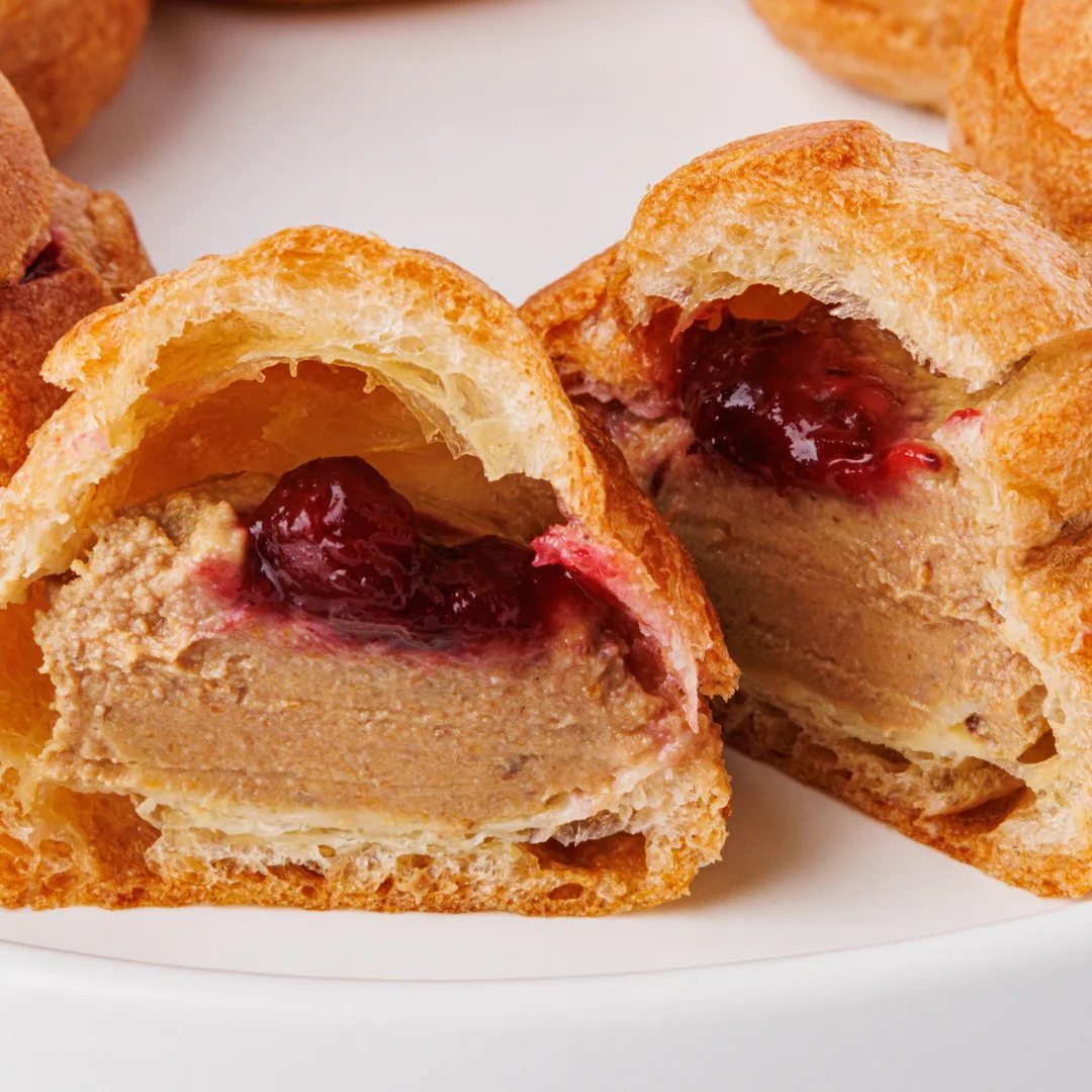 Воздушные профитроли с нежным сливочным паштетом и контрастным брусничным соусом. Сбалансированная, эффектная закуска для праздничного стола.