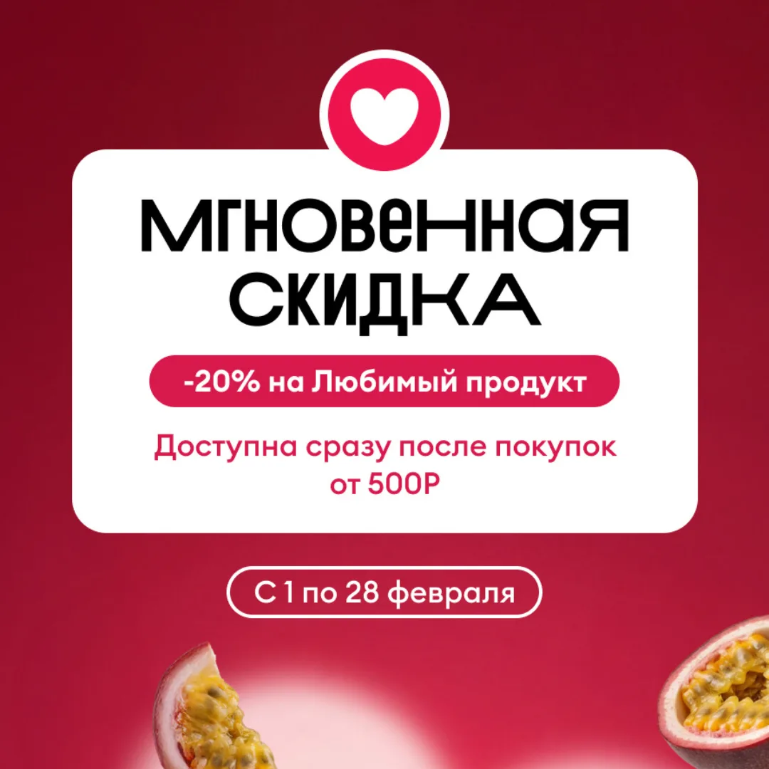 Весь февраль скидка в 20% начинает действовать сразу после назначения Любимого продукта. А это значит, что можно поддаться вкусным сиюминутным желаниям, не томясь в ожидании следующего дня, — сразу, в этот же день, купить любимчика на 20% дешевле.