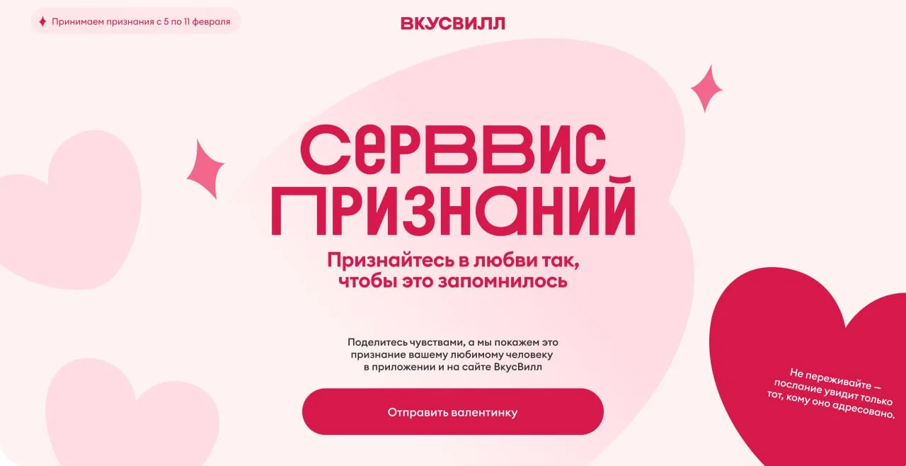 Это специальный лендинг, на котором вы можете отправить признание в любви своей второй половинке — а 14 февраля получатель увидит слова любви на баннере в разделе «Моя карта» в приложении и на главной странице сайта ВкусВилл. Но не стоит переживать: признание будет видеть только тот, кто его получил.