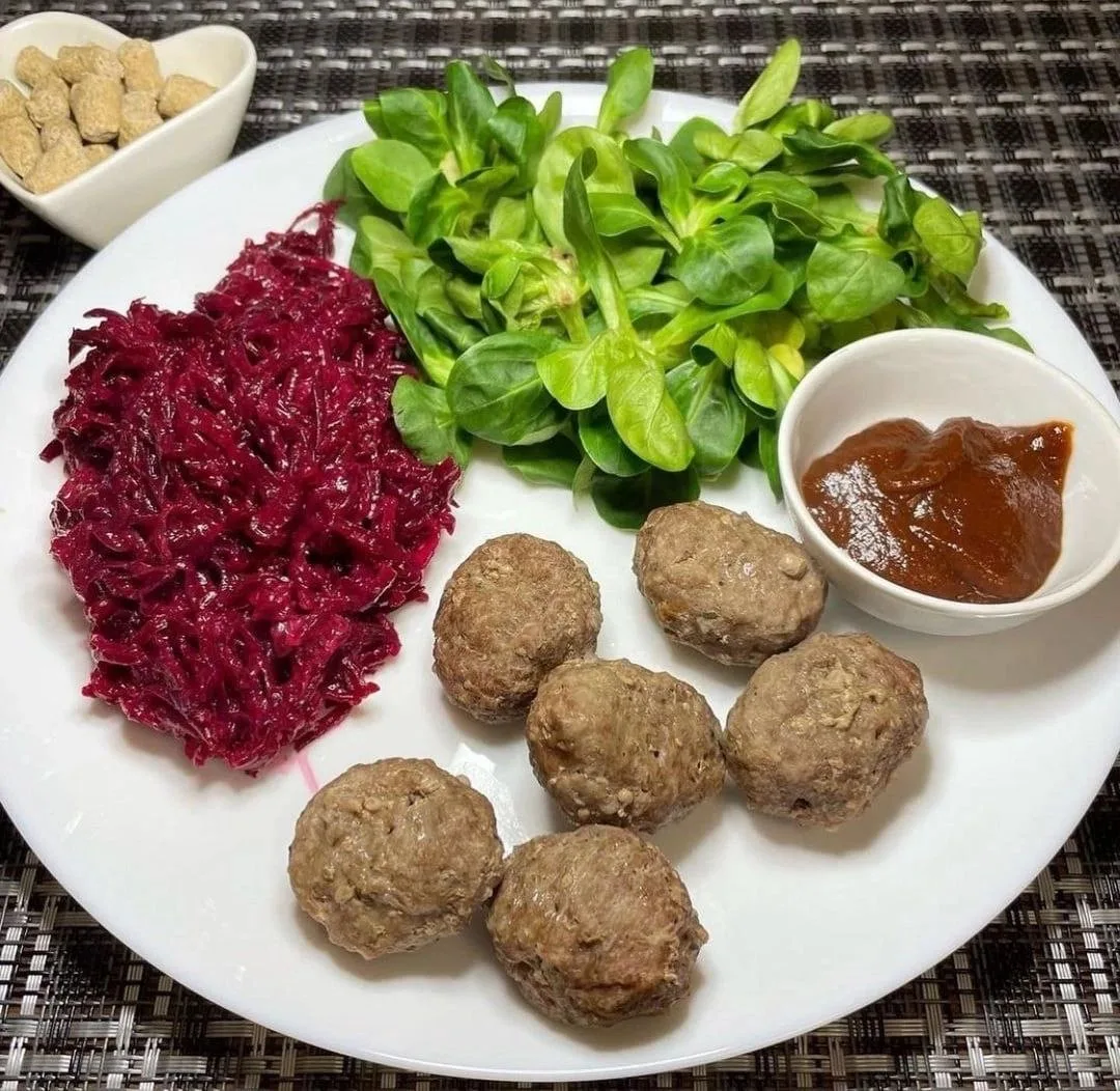 ⚪️Морковь и лук измельчить в блендере и смешать с фаршем. Сформировать фрикадельки, обжарить с двух сторон. Помидоры измельчить в блендере и добавить к фрикаделькам. Тушить около 15 мин на медленном огне. Гречку отварить