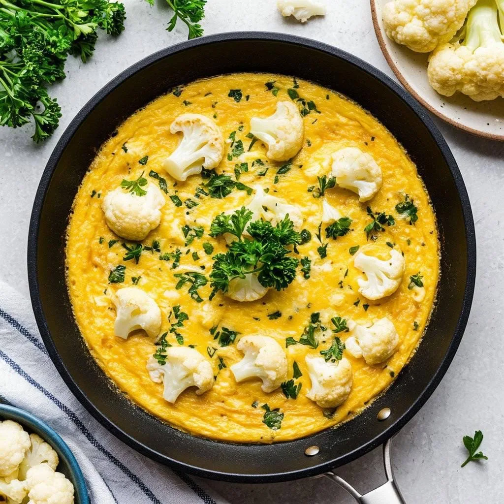 Положите слайсы цветной капусты и обжаривайте по 1-2 минут с каждой стороны до румяной корочки. Залейте обжаренную капусту яичной массой. Закройте сковороду с омлетом с цветной капустой крышкой и готовьте на медленном огне в течение 3 минут. Готовый омлет посыпьте рубленой зеленью.