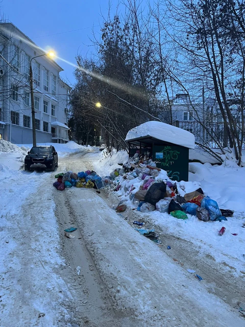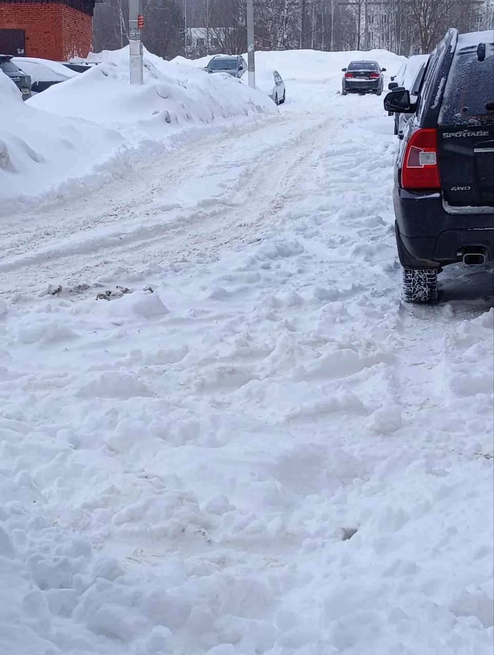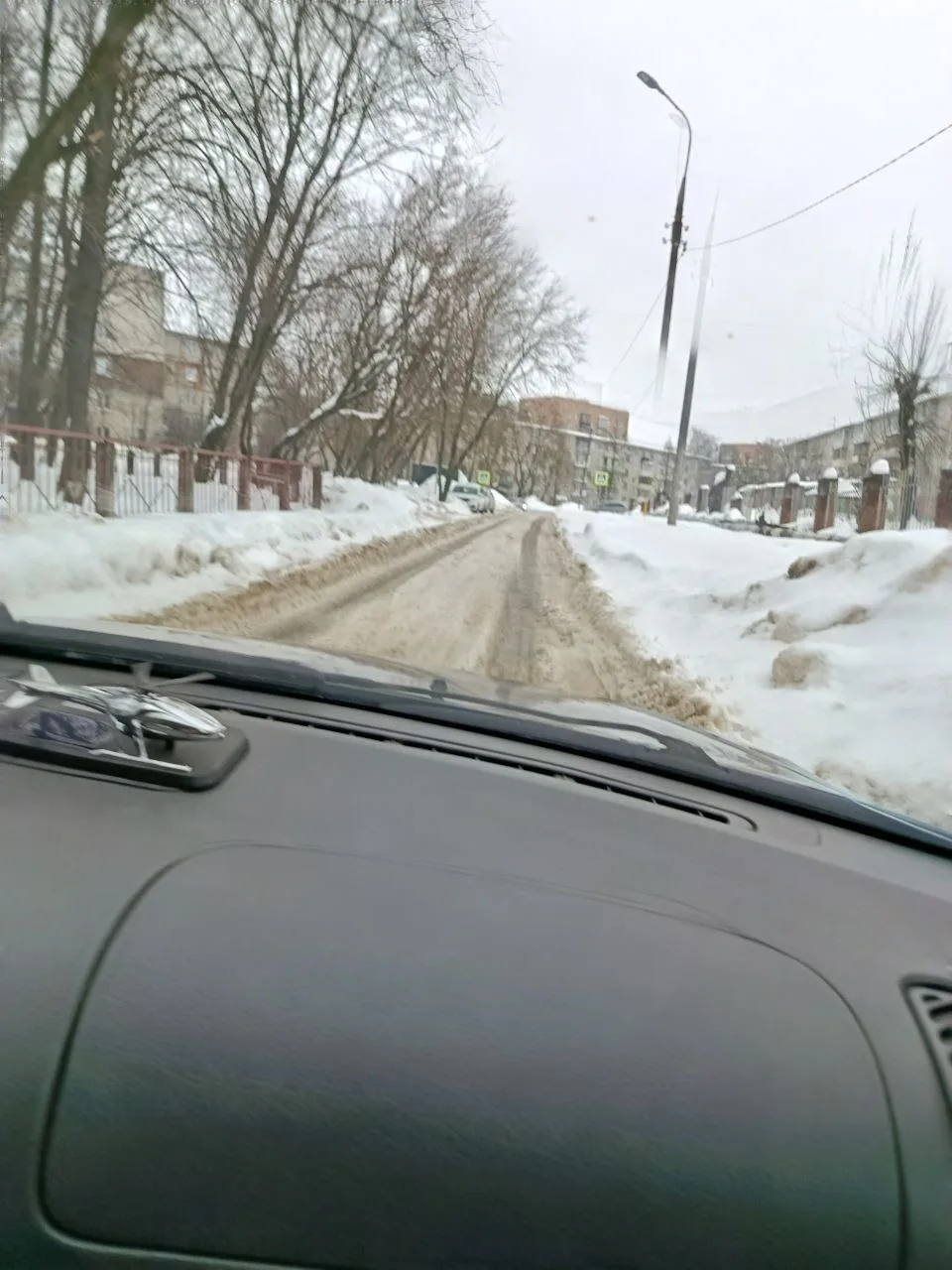 С права тротуар( гора снега) вдоль ДС 64. С лева забор шк 15. Впереди машина заехала на парковку и ждёт когда мы приедем. То же и скорая и пожарные машины будут ждать когда приедут машины, ТК из колеи не выехать.