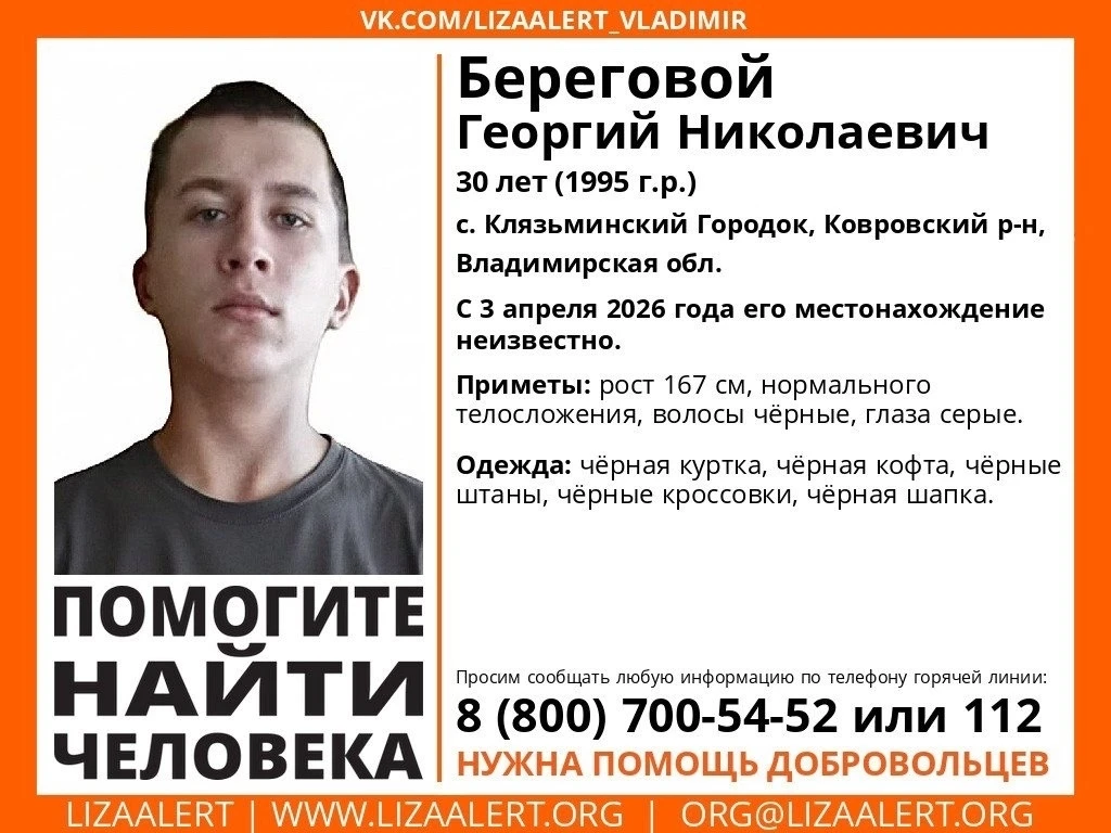Пропал Береговой Георгий Николаевич 1995 г.р. (30 лет), с. Клязьминский Городок, Ковровский р-н, Владимирская обл.