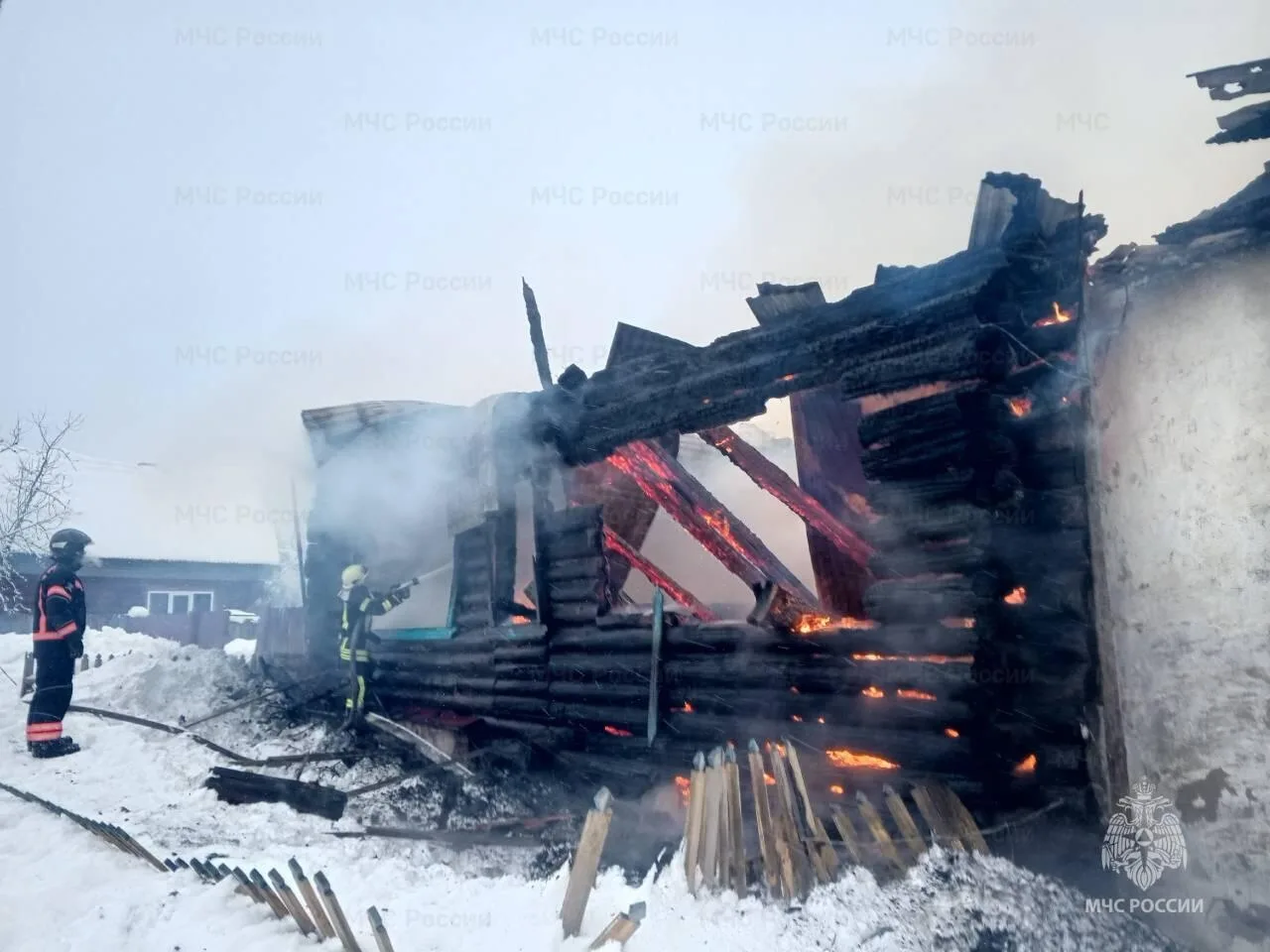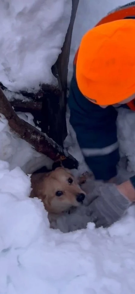 Инцидент произошел утром на частном подворье. Снежная масса заблокировала хозяйку в доме и накрыла собаку во дворе. Прибывшие спасатели расчистили проход, нашли животное под сугробом и освободили его.
