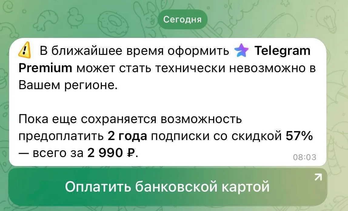 Telegram рассылает российским пользователям уведомление о том, что покупка Premium скоро может стать технически невозможной.