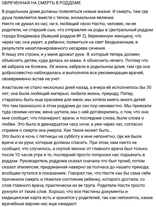 Во владимирском роддоме скончалась 29-летняя Анастасия. Ее муж Олег Шаров опубликовал пронзительное обращение, в котором заявил, что в медучреждениях области смерть рожениц случается всё чаще. Свой пост он озаглавил «Обреченная на смерть в роддоме».