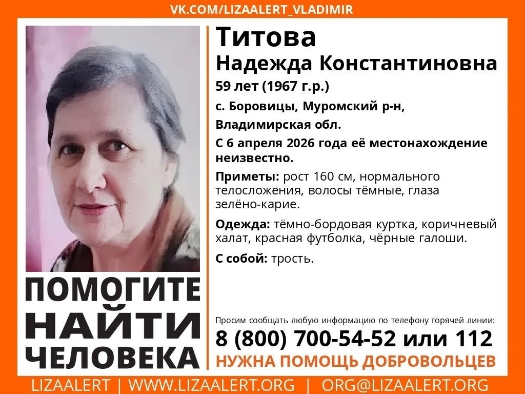 Пропала Титова Надежда Константиновна 1967 г.р. (59 лет), с. Боровицы, Муромский р-н, Владимирская обл.