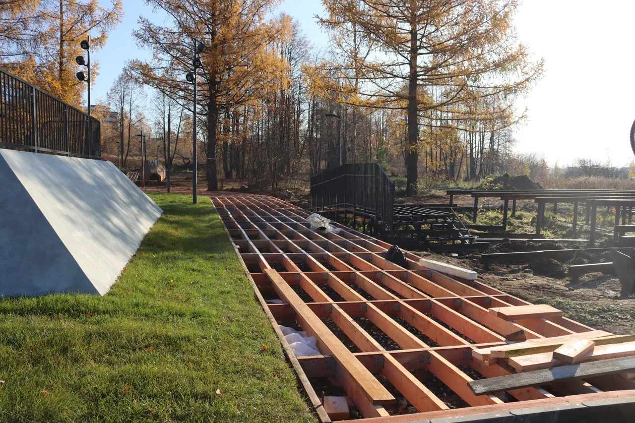 Продолжаются работы по укладке тротуарной плитки в пешеходной зоне, установка бордюров на лыжероллерной трассе, организация площадки для выгула и дрессировки собак.