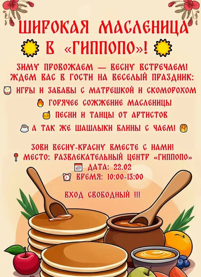 Друзья, 22 февраля приглашаем вас на самый вкусный и веселый праздник проводов зимы! ⏰ Ждем вас с 10:00 до 13:00.
