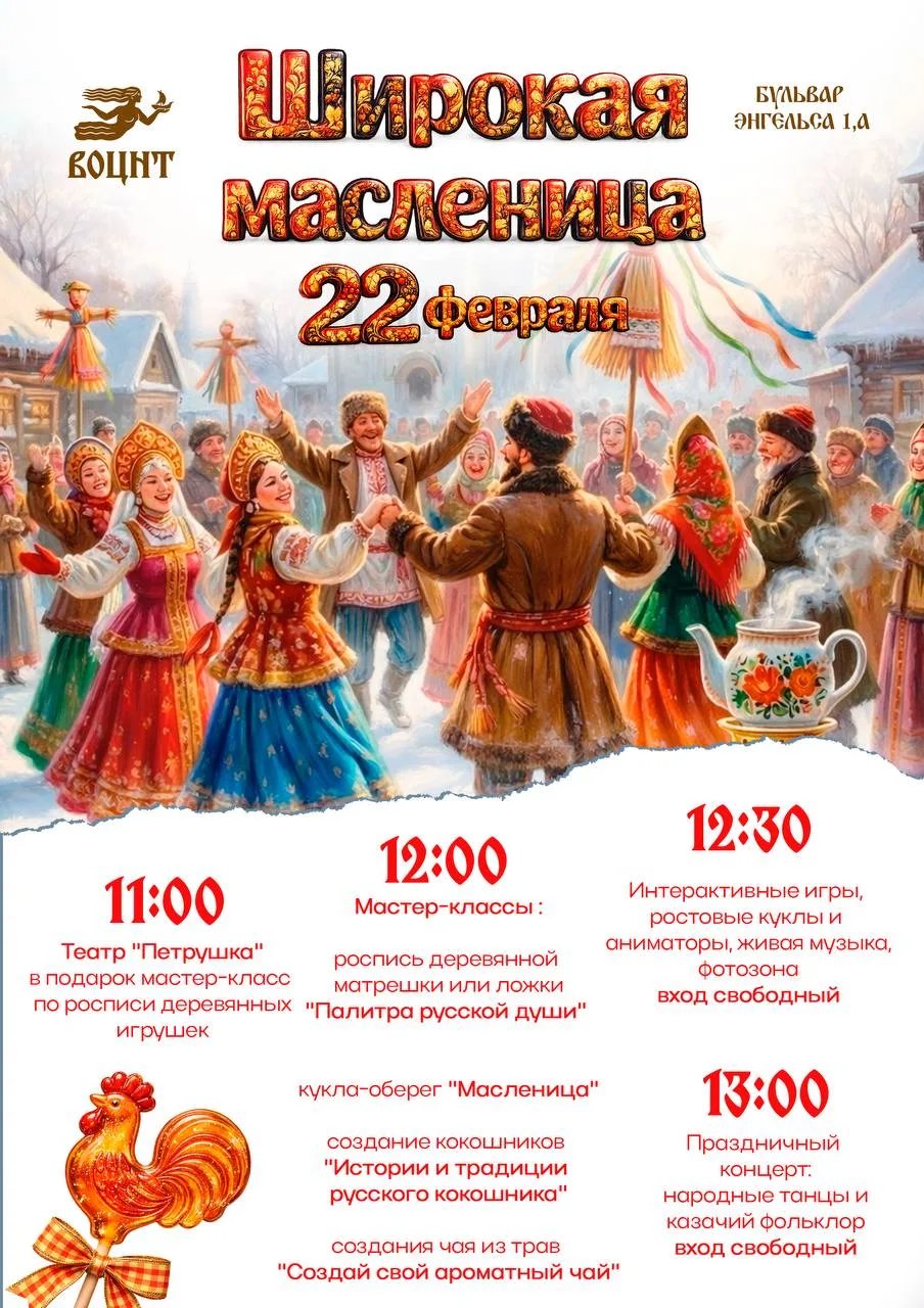 🎨 12:00 — Мастер-классы: роспись деревянной матрешки или ложки "Палитра русской души", кукла-берегиня "Масленица", создание кокошников "История и традиции русского кокошника", а также создание чая из трав.
