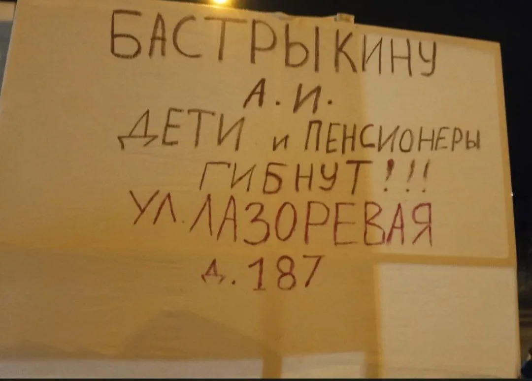 Жители дома на Лазоревой вышли на Вторую Продольную с баннерами к Бастрыкину и Бочарову. Люди рыдали, умоляя о тепле, пока их дети стучали зубами от холода.