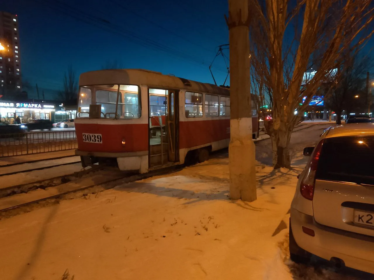 Вечером 21 февраля на подъезде к разворотному кольцу «Судоверфь» вагон сошел с рельсов. Задняя тележка пропахала глубокую колею между путями.