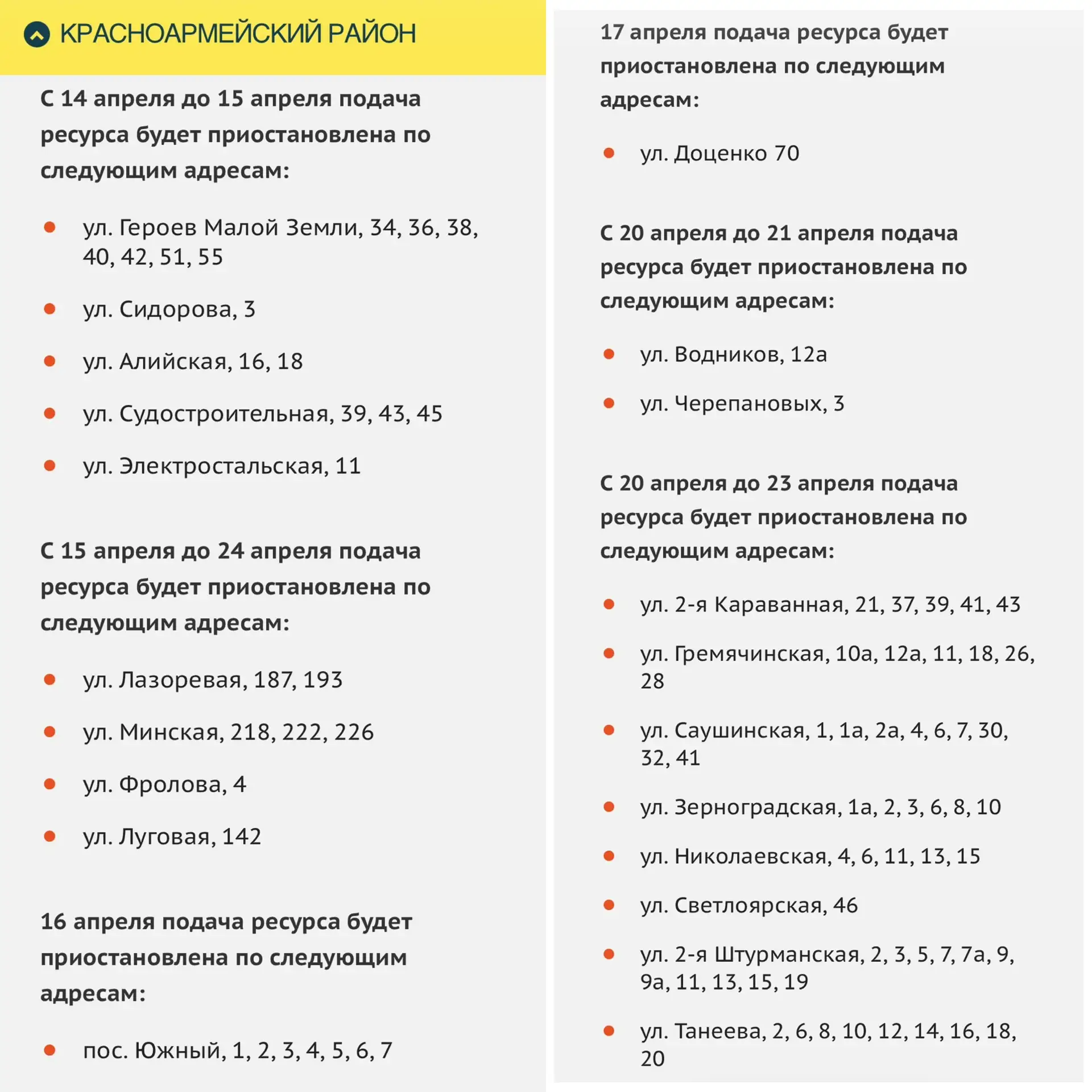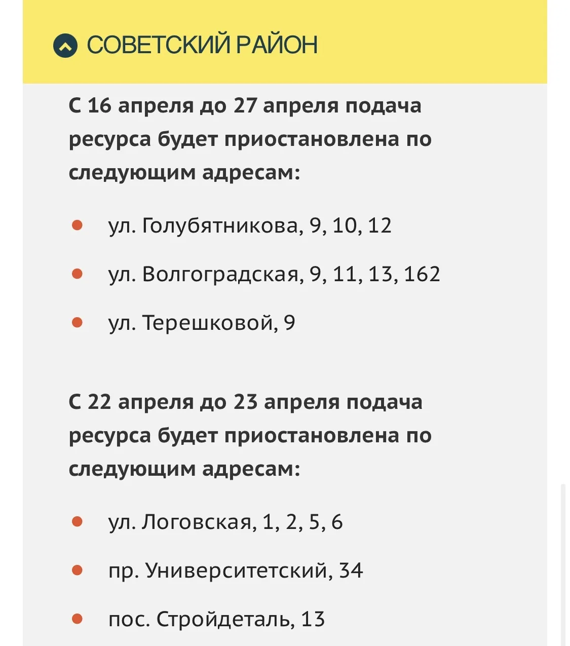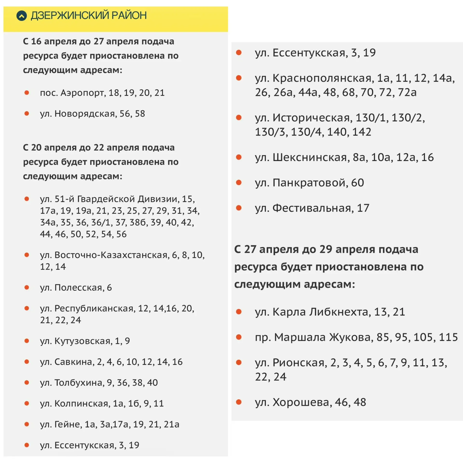 Сроки отключения и адреса по другим районам смотрите в карточках. Даты могут быть скорректированы.