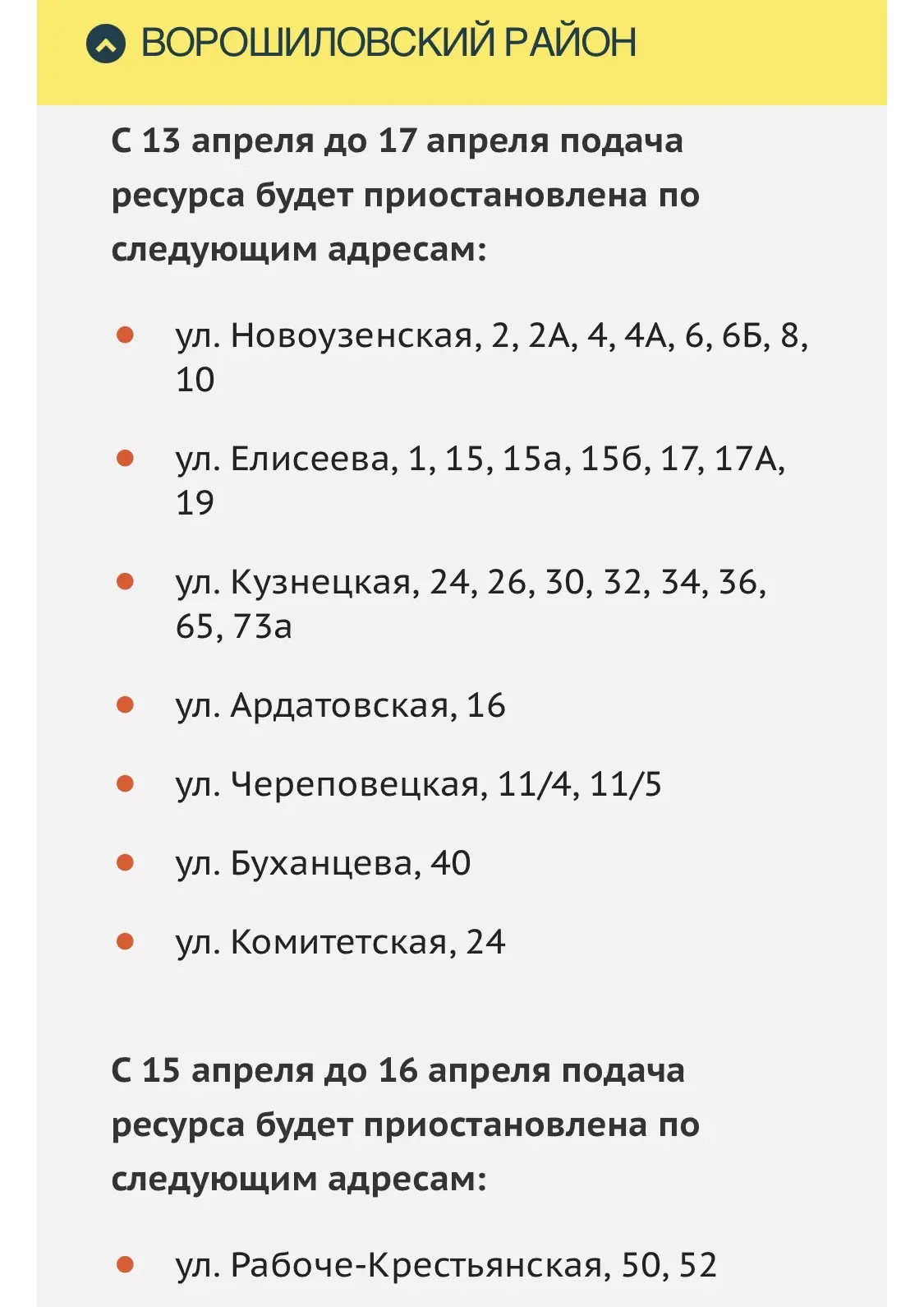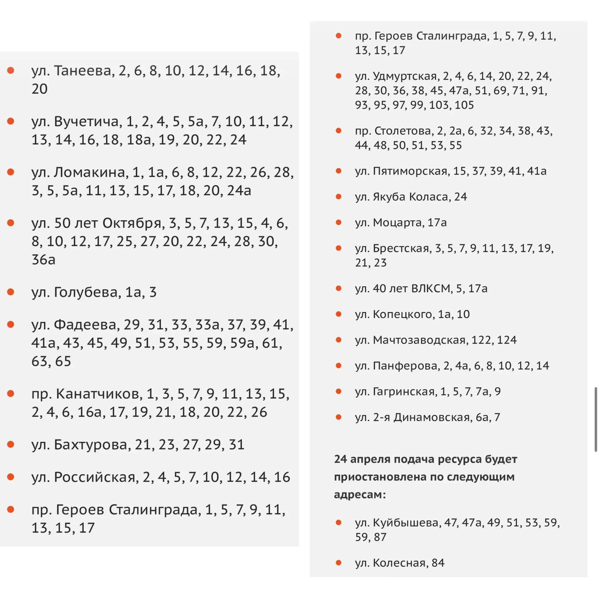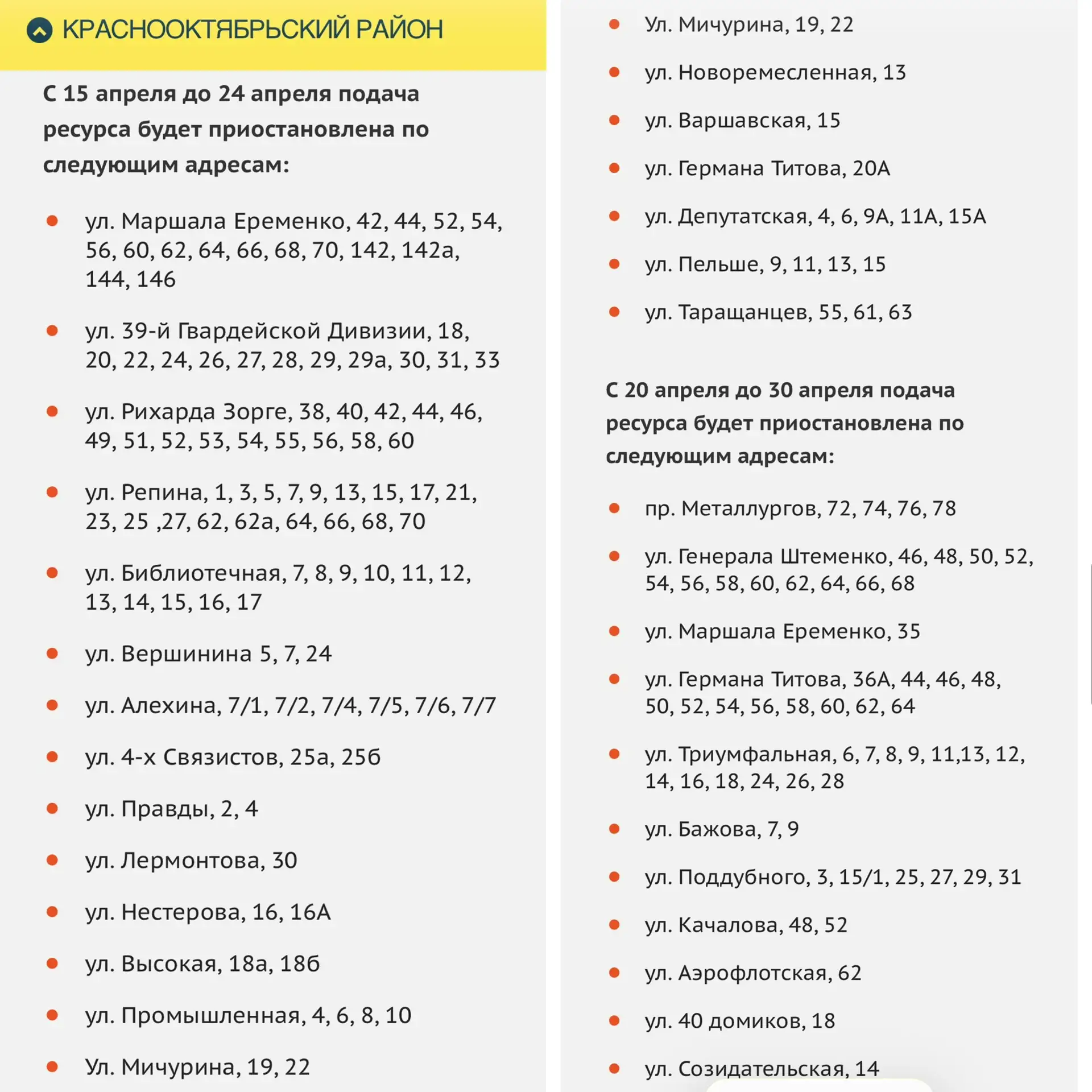 Сроки отключения и адреса по другим районам смотрите в карточках. Даты могут быть скорректированы.