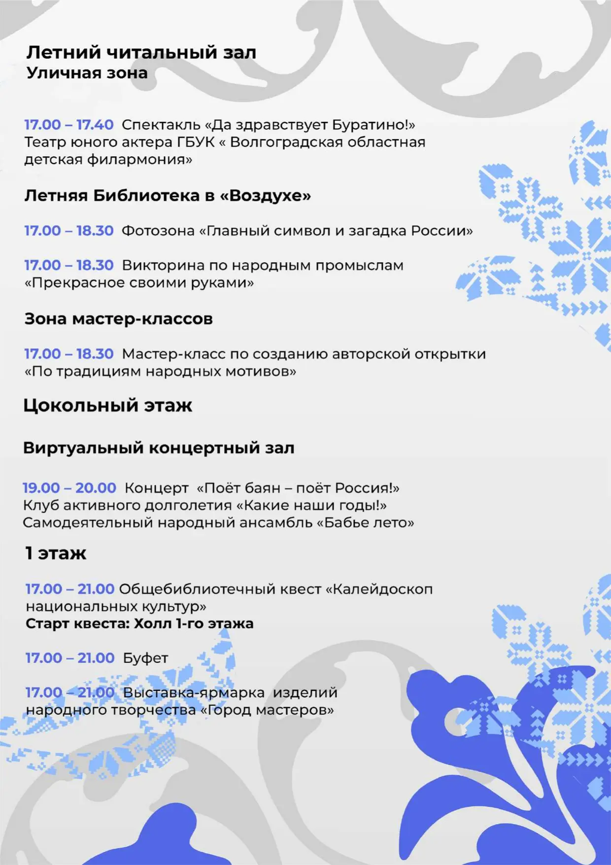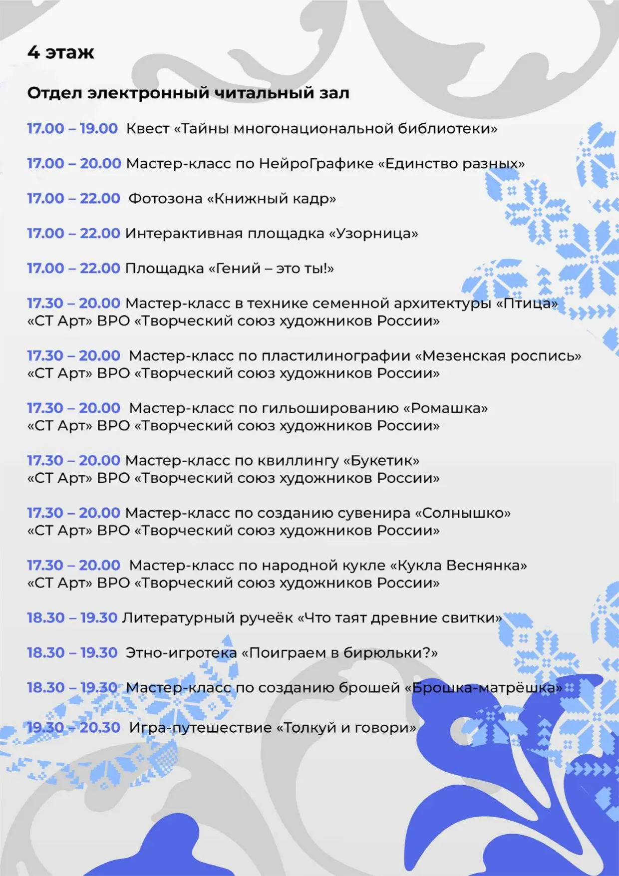 17:30 — торжественное открытие в Зале каталогов на третьем этаже. В программе — концертные и сценические номера, авторские дефиле, танцевальные мастер-классы, показ коллекции русских народных костюмов «Гжель» и «Хохлома».