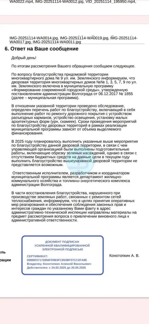 «Дворовая территория многоквартирных домов №№ 1, 3, 5, 7, 9 по ул. им. Землянского, №№ 51, 51а по пр. им. В.И.Ленина включена в муниципальную программу «Формирование современной городской среды». Количество ежегодно благоустраиваемых дворовых территорий зависит от объема выделяемых бюджетных средств. В текущем году благоустройство указанной дворовой территории не запланировано. При выделении дополнительного финансирования в текущем году будет рассмотрена возможность благоустройства данной дворовой территории», — ответили в администрации Волгограда.
