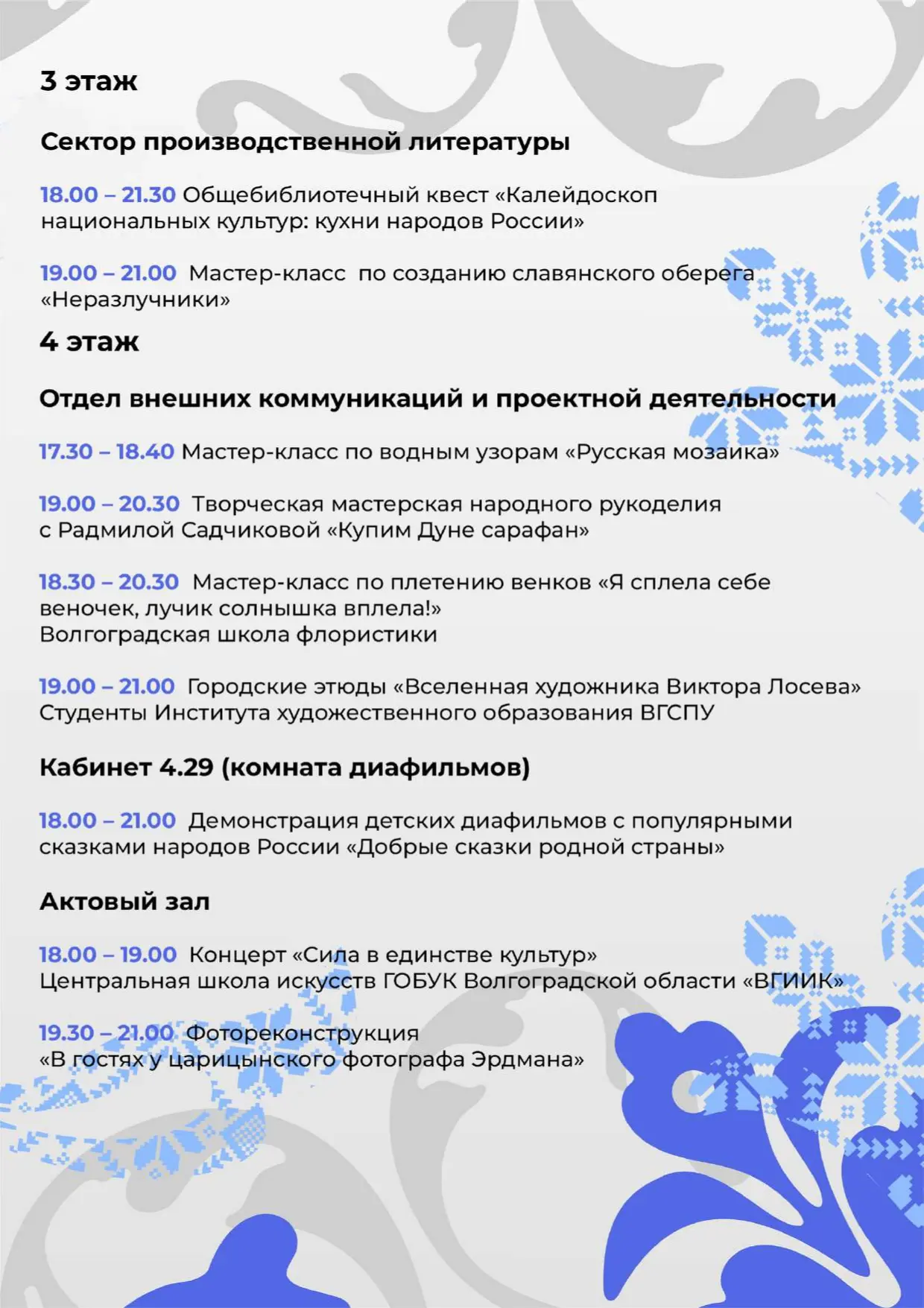 17:00 — лекция «Эта Земля твоя и моя» о культуре народов Волгоградской области.