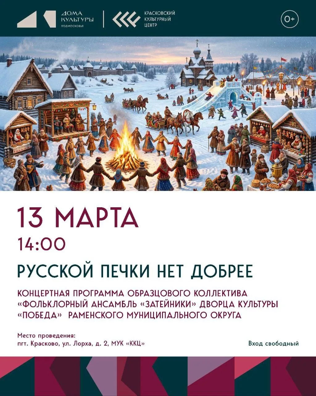 👉🏻 В 14:00 вас ждет концертная программа «Русской печки нет добрее» в исполнении Образцового фольклорного ансамбля «Затейники», который занимается в ДК «Победа» м.о. Раменский.