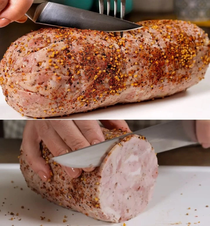 10. Когда колбаса остынет, аккуратно разворачиваем её. Даем ей полностью остыть перед нарезкой, чтобы она не потеряла форму. Нарезаем на тонкие ломтики. Колбаса будет ароматной и вкусной с красивой текстурой.