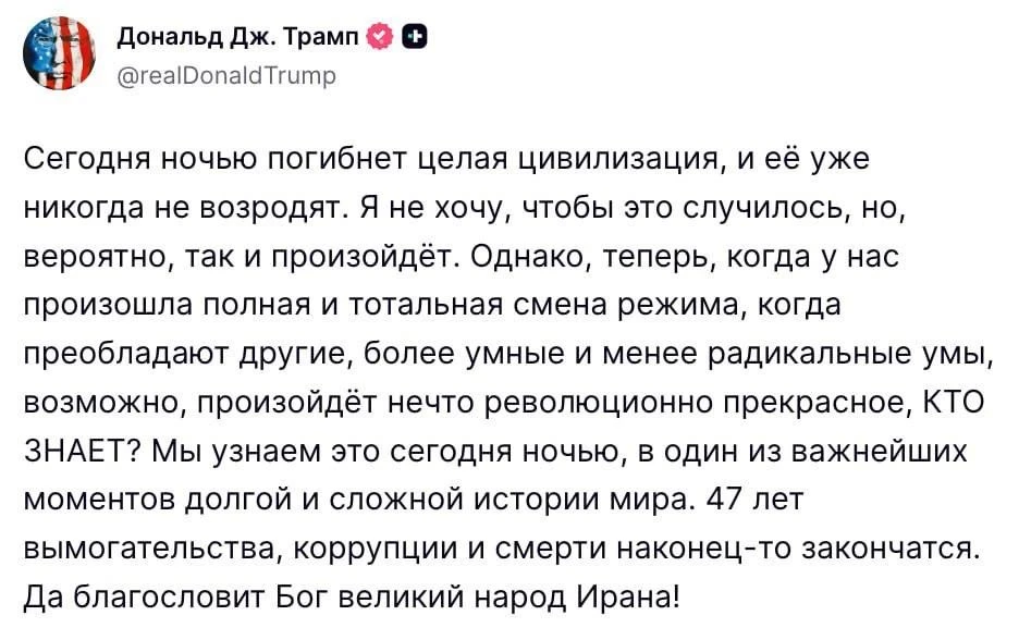 Целая цивилизация умрёт ночью, и её уже никогда не вернуть. 47 лет вымогательств, коррупции и смерти наконец закончатся, — написал американский президент в соцсетях.