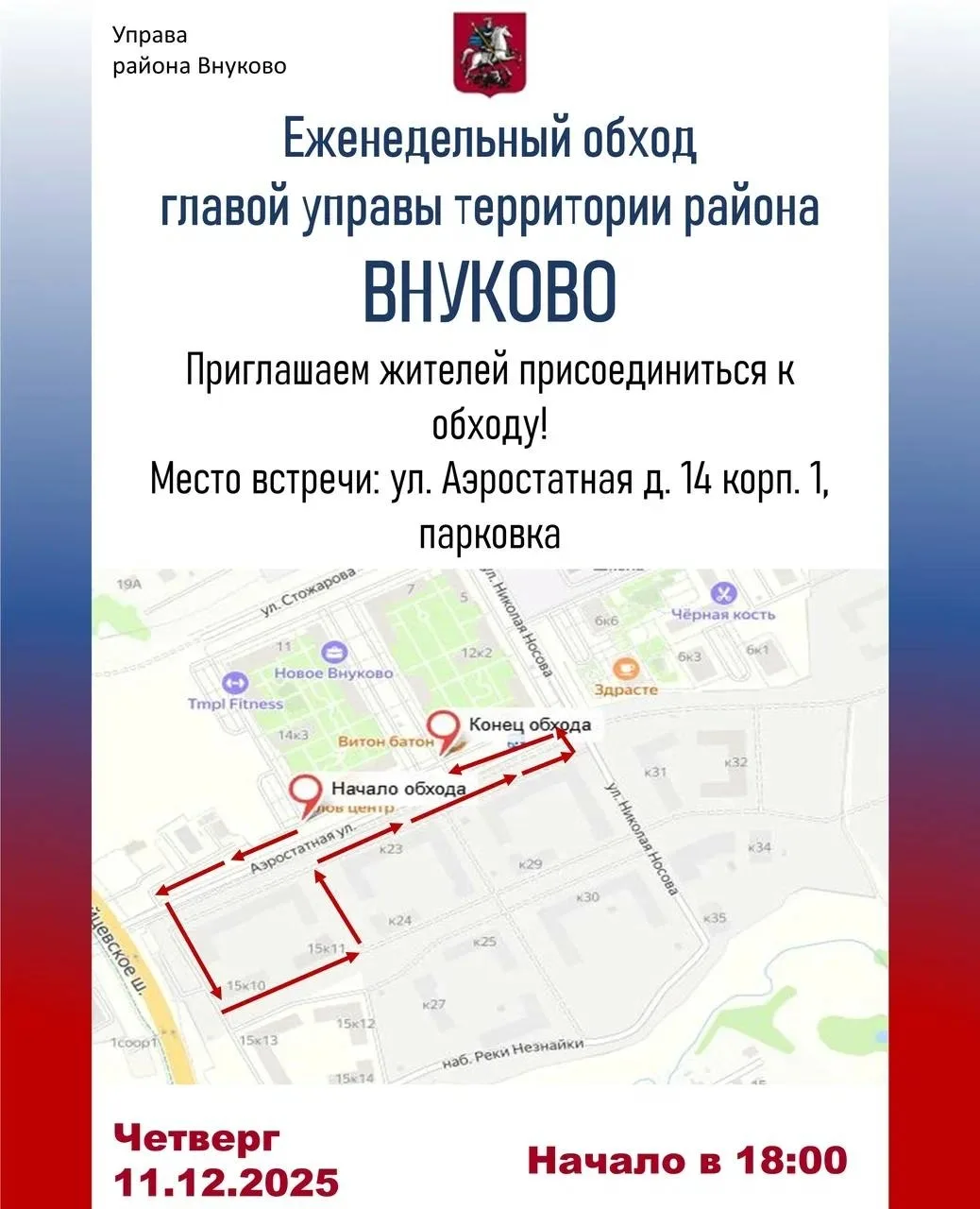 ⚡В четверг, 11 декабря, глава управы района Внуково Павел Федулкин проведет еженедельный обход территории.