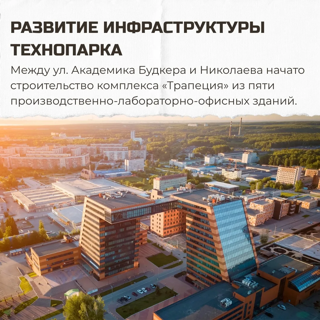 Также идёт активное развитие инфраструктуры Технопарка: между улицами Академика Будкера и Николаева начато строительство нового комплекса «Трапеция» с пятью производственными и лабораторно-офисными зданиями.