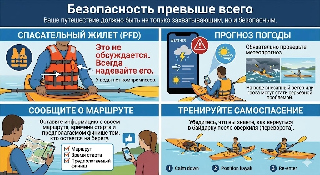 🦺 жилет каждому • 🛶 запасное весло • 🧴 2–3 гермомешка • 🧰 аптечка • 🧥 тёплый слой • 🧥 дождевик