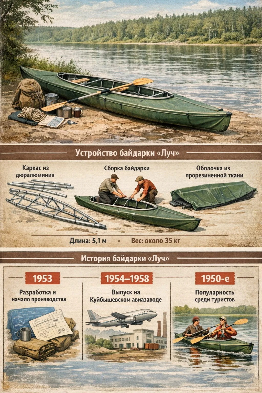 Когда в 1953 году с конвейера Куйбышевского авиазавода сошла первая партия байдарок «Луч», никто ещё не знал, что это судно станет символом зарождающегося массового водного туризма. Прочная, разборная, вместительная — она открыла реку и озёра тысячам советских туристов.