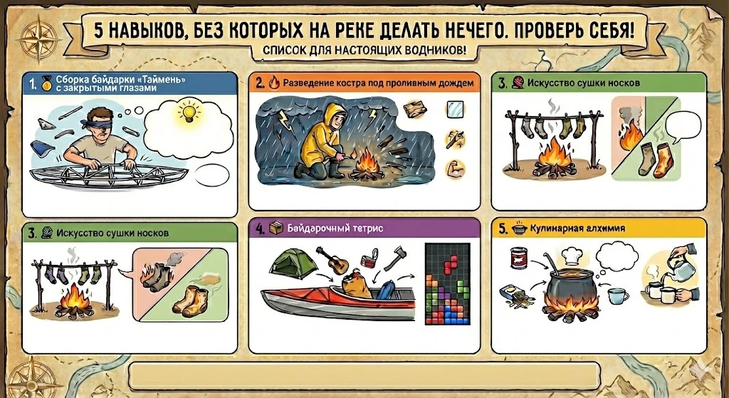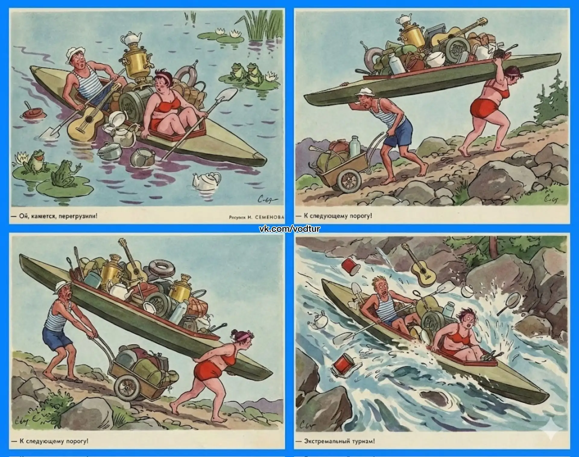 Героически грести час против течения, думая, что это "просто ветер встречный"? Кильнуться на ровном месте ради селфи? Забыть весла на берегу? Получить веслом по шлему от своего же матроса? Уронить в реку котелок с готовым ужином? Убедить группу "срезать путь" и завести всех в глухое болото? Пытаться отбиться веслом от наглых уток? Классика!