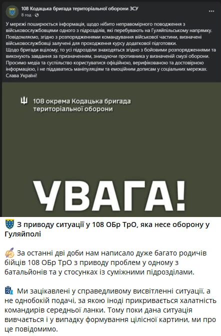 🔸Свинстейт продолжает нести чушь про 108 бригаду территориальной обороны, которая, якобы удерживает позиции в Гуляй-поле. И чушь там везде, начиная с того, что они что-то там обороняют, заканчивая выдумками про "занятия", которые добрые зеки из 225 ошп проводят для личного состава бригады под дулами автоматов.