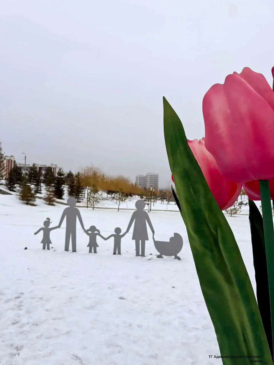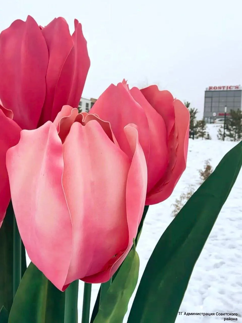 В Советском районе весна наступила чуть раньше календаря. В Родниковой Долине появилась необычная фотозона — огромные тюльпаны, «расцветшие» прямо в снегу.