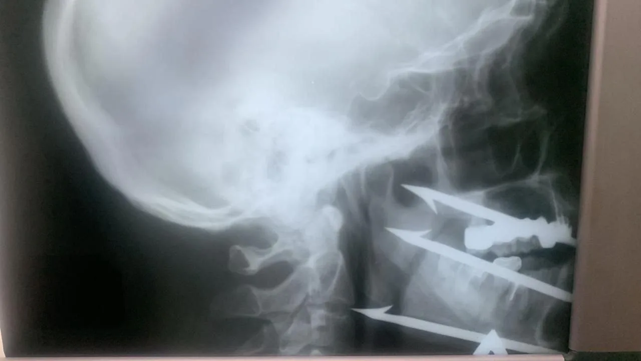 Трехзубый гарпун глубоко вошел в ткани лица. Ситуация была критическая, копье остановилось в миллиметре от сонной артерии.