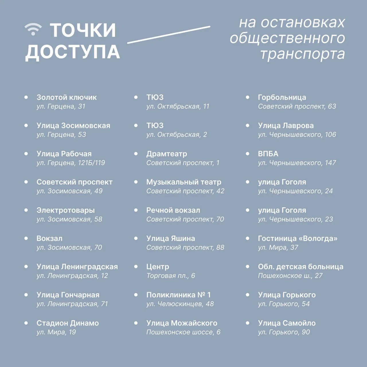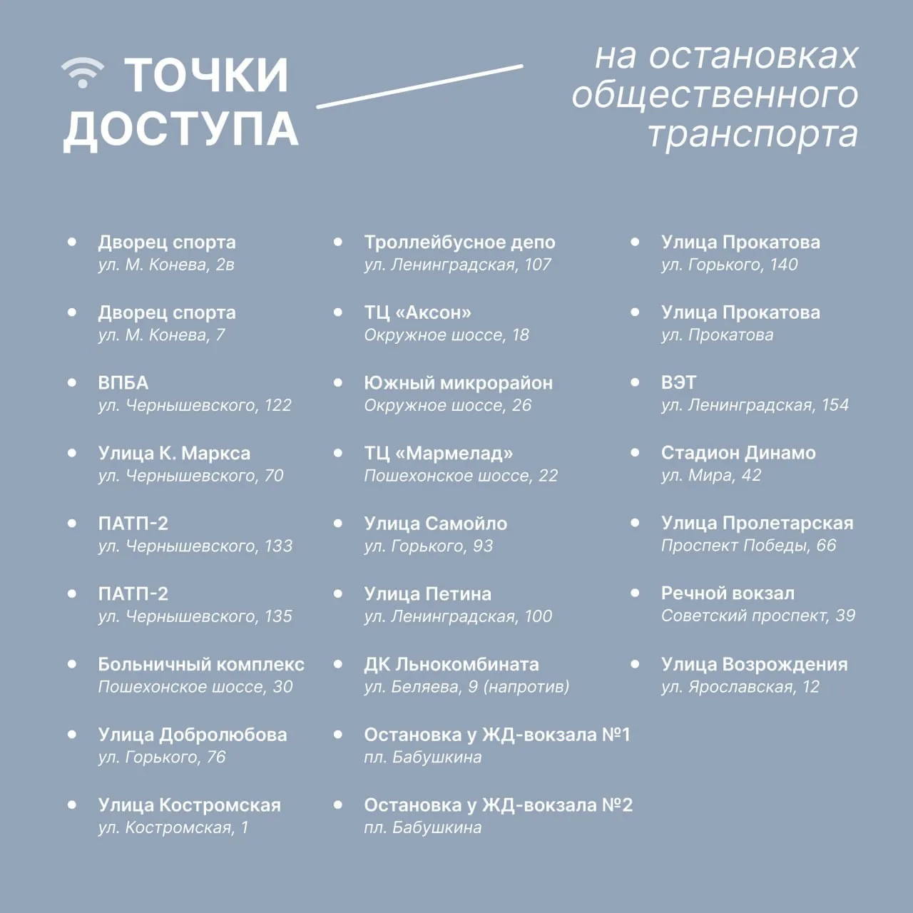 Wi Fi появился в парке Ветеранов, на площади Дрыгина, площади Федулова, площади Чайковского, площади Бабушкина, аллее на проспекте Победы, Каменном мосту, площадке перед стадионом «Динамо» и в Евковке.