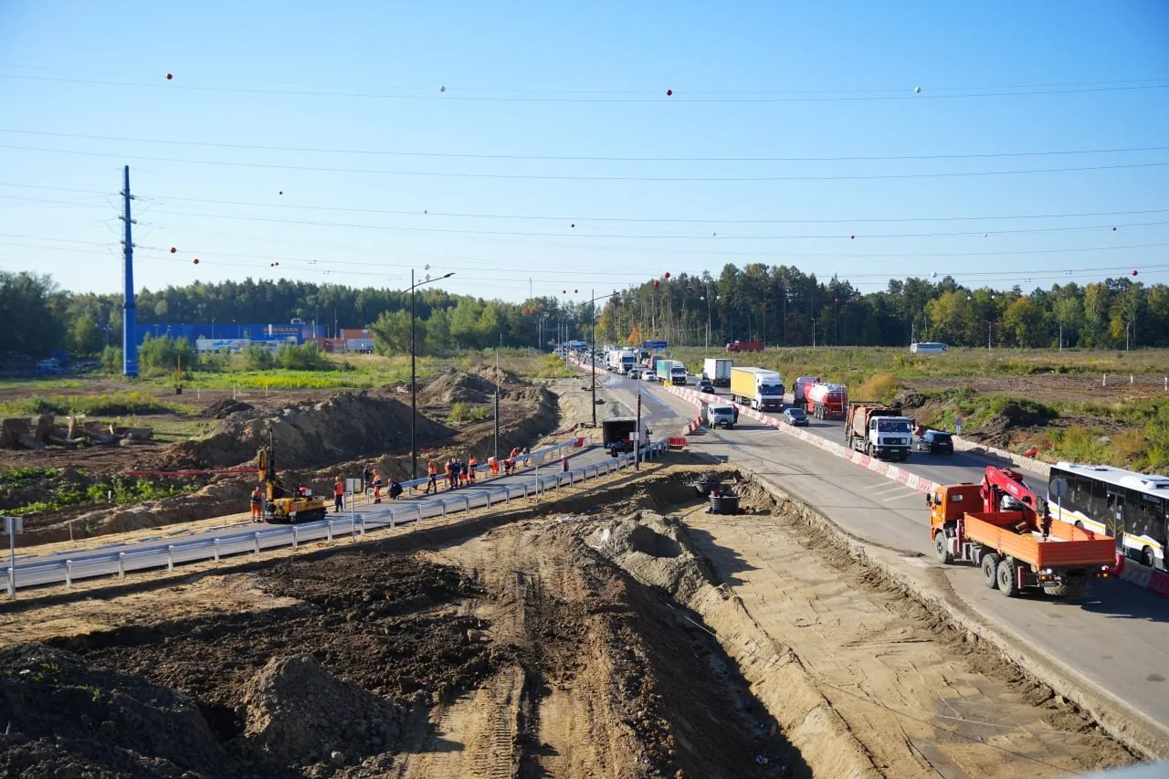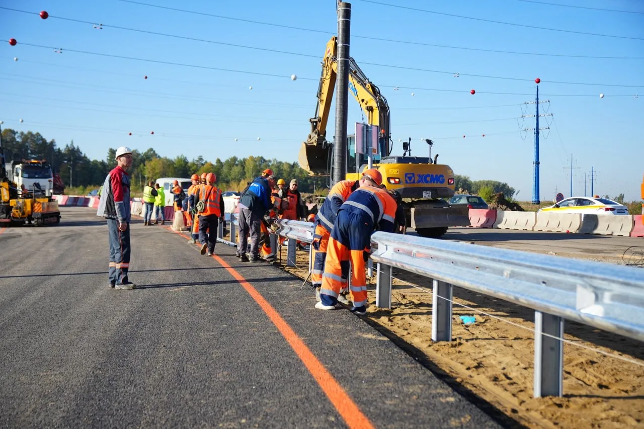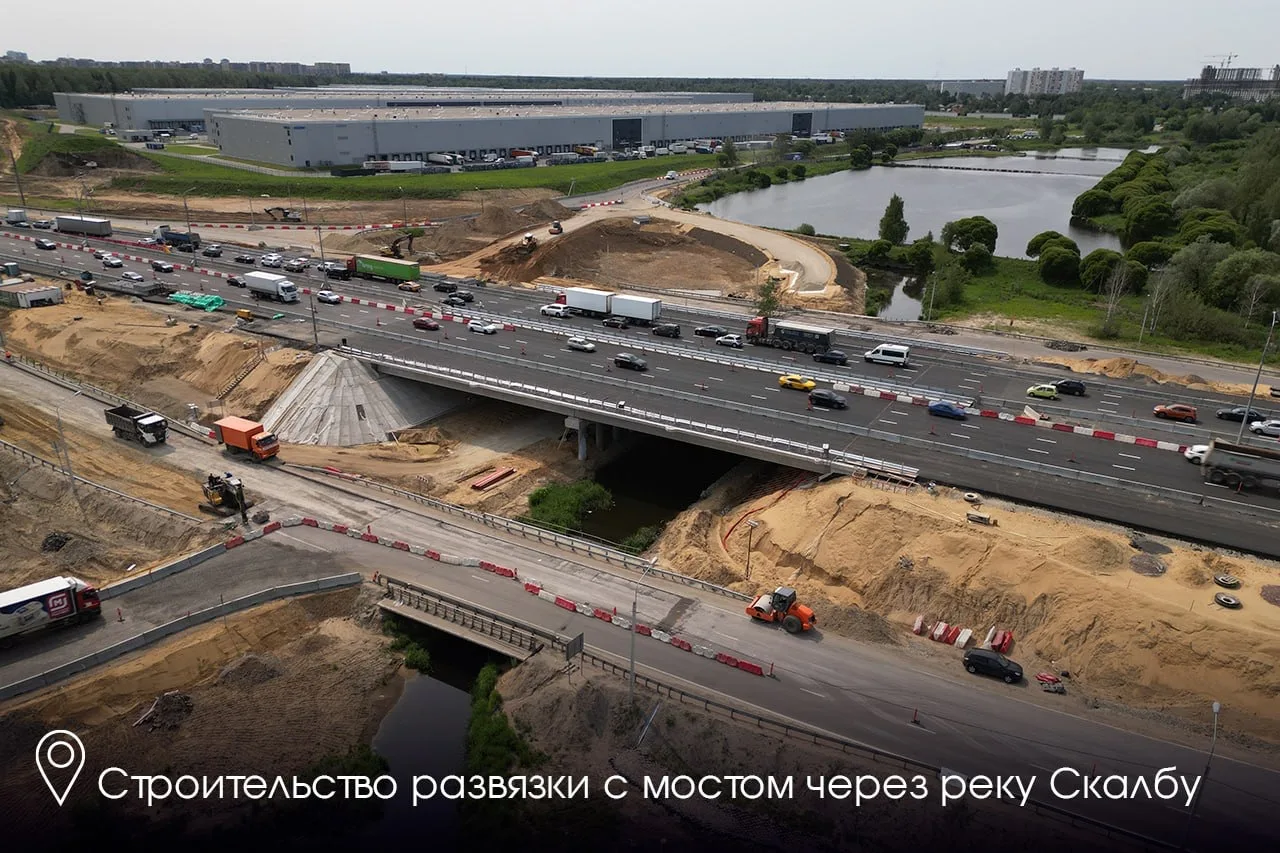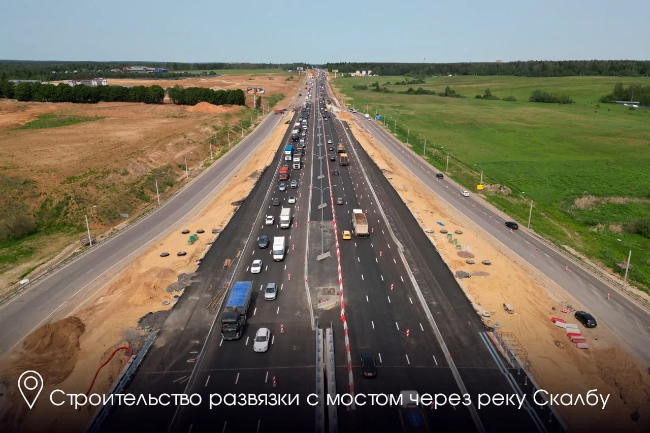 🚙 До конца октября обновим развязку с мостом через реку Скалбу. На участке от Красноармейского шоссе до села Братовщина открыто движение по шести полосам, все восемь запустим в 2027-м году.
