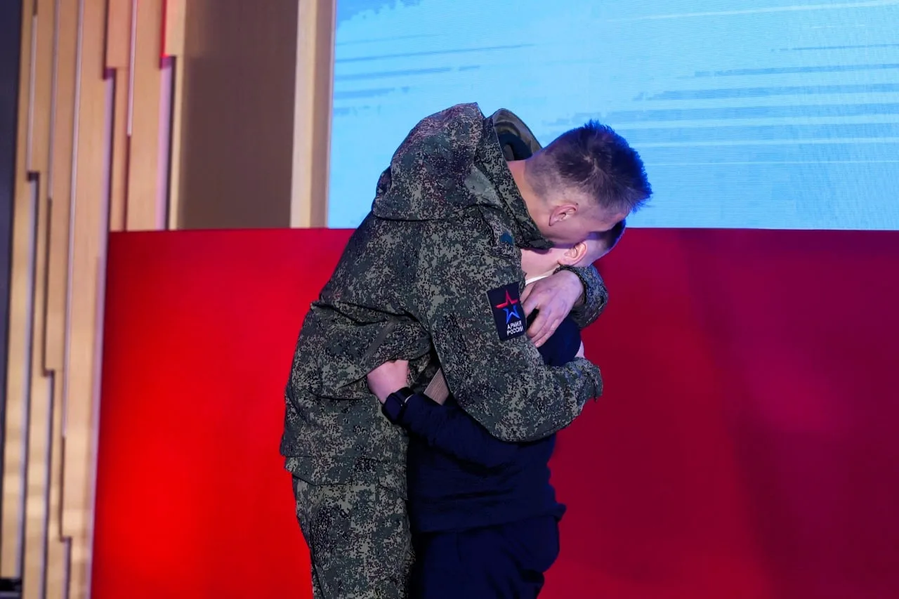 🔹Еще один лауреат — гвардии сержант Никита с позывным «Кащей», который тоже с 2022 года участвует в СВО. Награжден медалью «За храбрость» II степени. Под огнем противника возглавил штурмовую группу, закрепился в населенном пункте и отбил контратаку. Награду сегодня получил его 9-летний сын Семен. Мы подготовили для него сюрприз — на сцену поднялся и сам «Кащей». Встреча получилась по-настоящему трогательной.