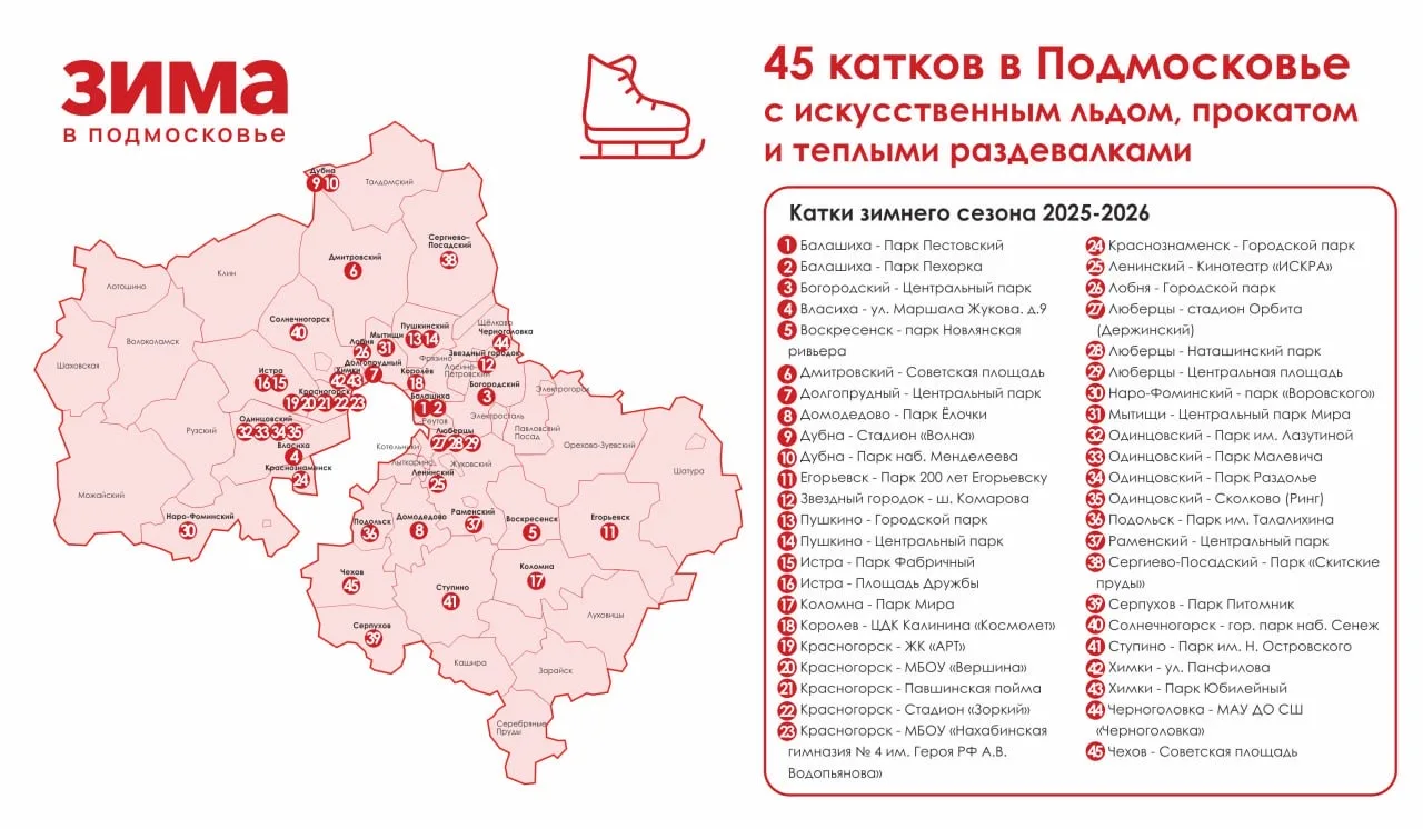 ❄️ Сегодня мы открываем зимний сезон. В Подмосковье будут работать 45 сезонных катков с искусственным льдом, включая пять новых: в Дмитрове, Воскресенске, Звездном городке, Власихе и Краснознаменске. Там, где лед будет натуральный, откроем позже, когда установится минусовая погода.