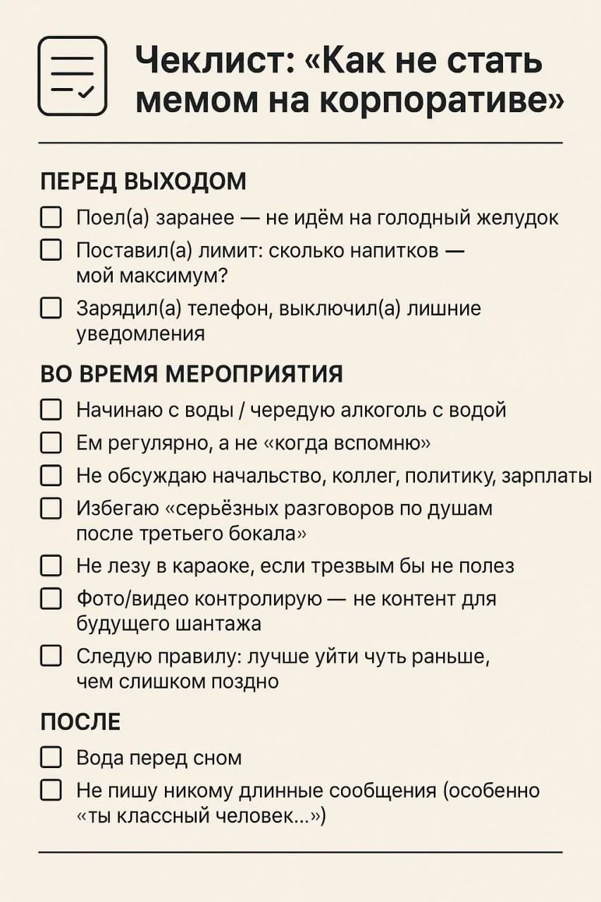 🥴Опа! Подъехал годный чек-лист о том, как не опозориться на корпоративе