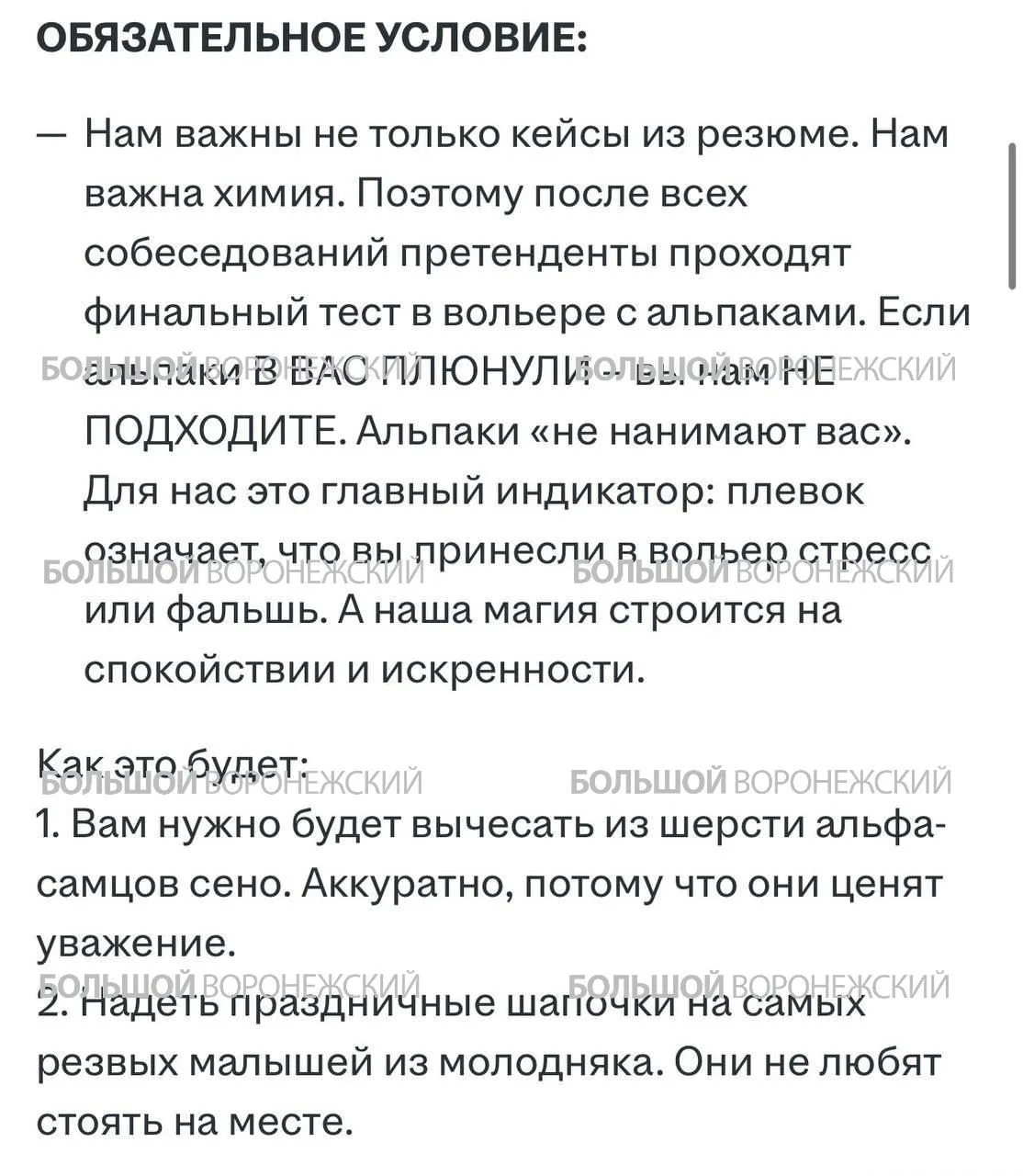 Если альпаки в вас плюнули – вы не подходите, потому что принесли стресс и фальшь. Если всё же тест прошли, то обещают годовой запас морковки и 150К на ручки.