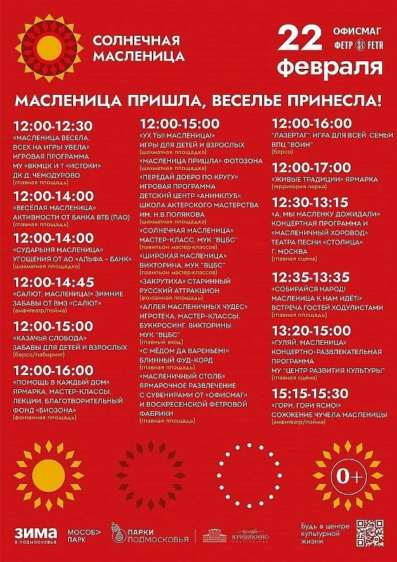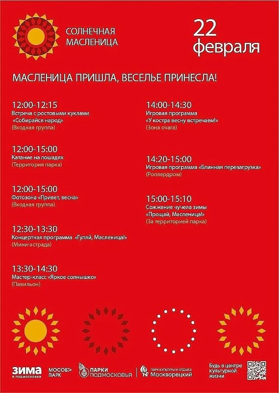 ☀️🥞 22 февраля парк усадьбы Кривякино и парк "Москворецкий" приглашают гостей и жителей округа на празднование Масленицы, проводы зимы и встречу долгожданной весны.