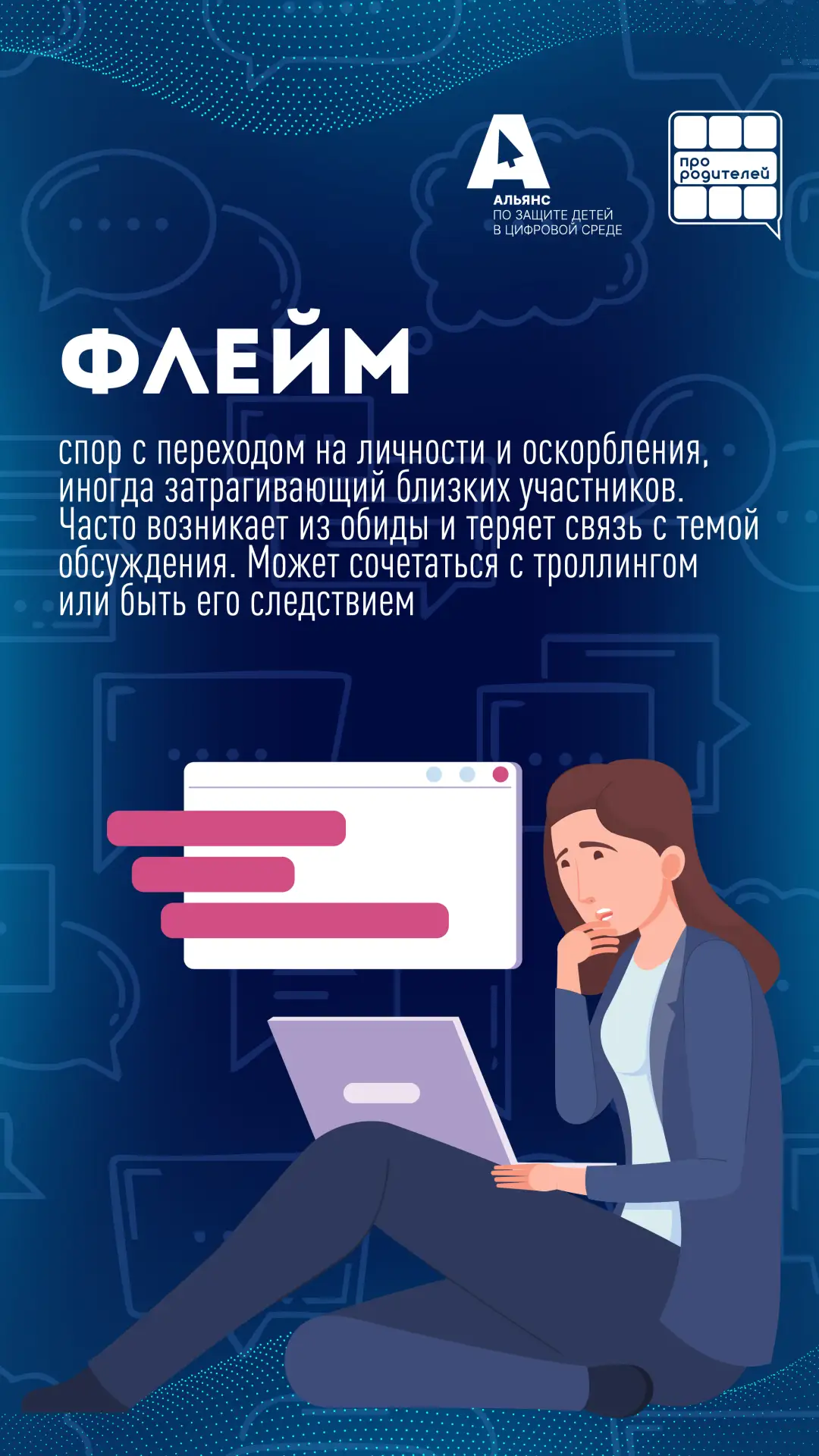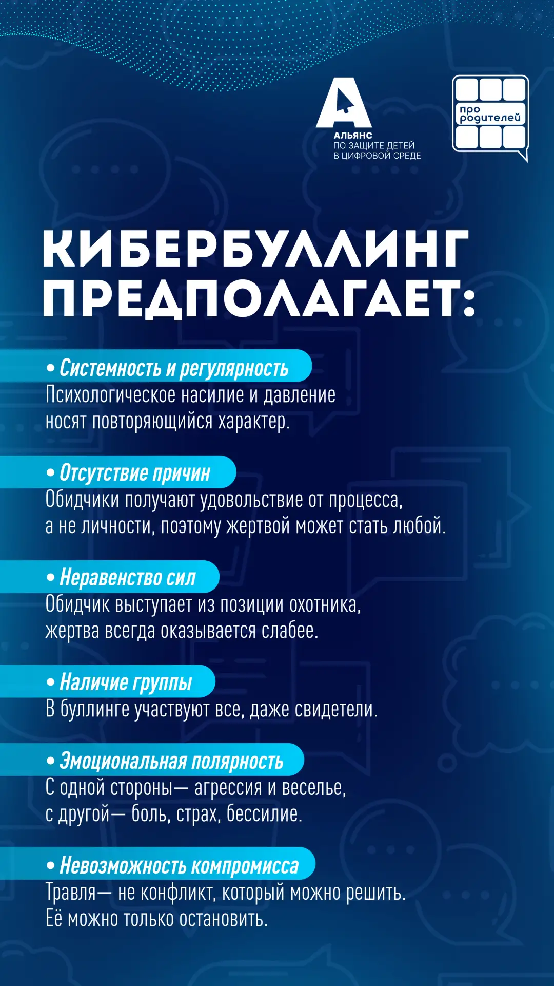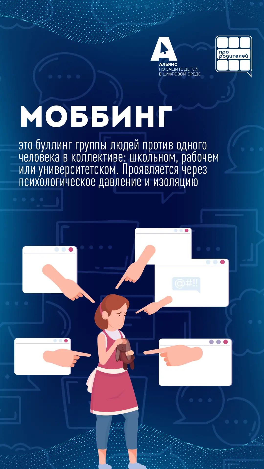 Елизавета Белякова, председатель «Альянса по защите детей в цифровой среде (https://t.me/internetforkids_ru)», расскажет о видах кибербуллинга. Это поможет лучше понимать детей и общаться с ними на одном языке.