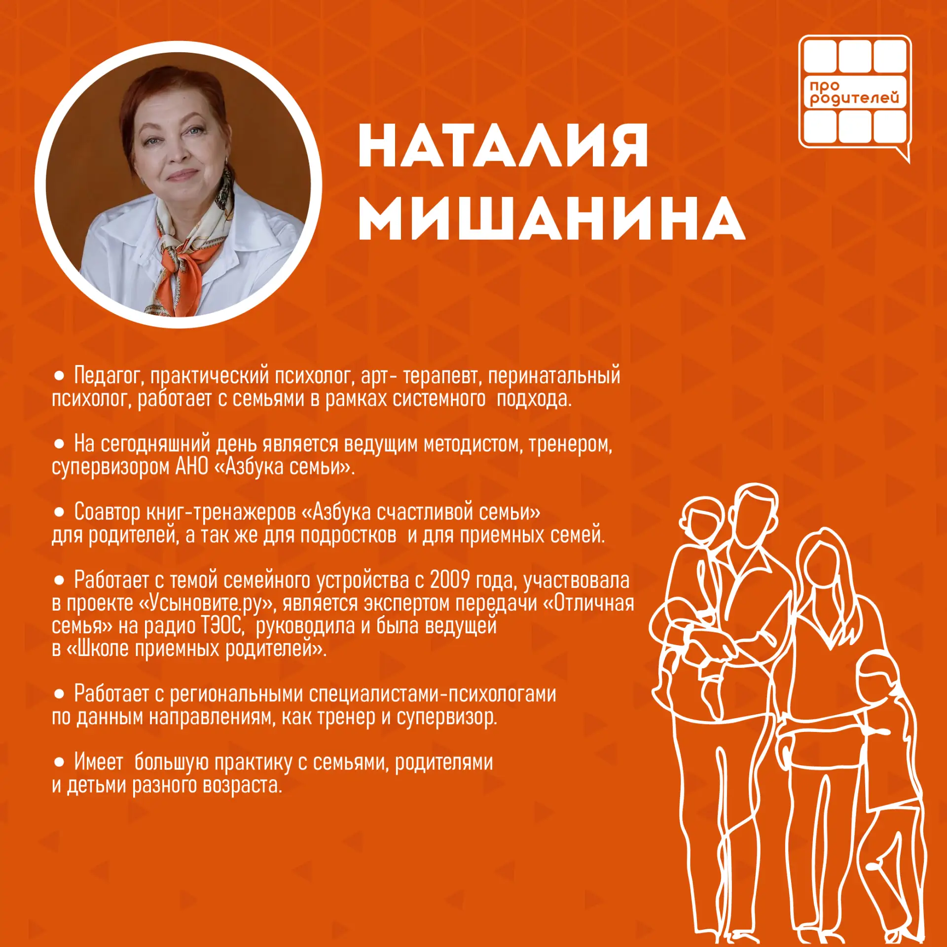 ⏺️Наталия Мишанина — это не просто психолог, это: педагог, практический психолог, специалист по детско-родительским отношениям, эксперт в области семейного устройства, тренер Школы развития эмоций, ведущий методист, тренер, супервизор АНО «Азбука семьи».